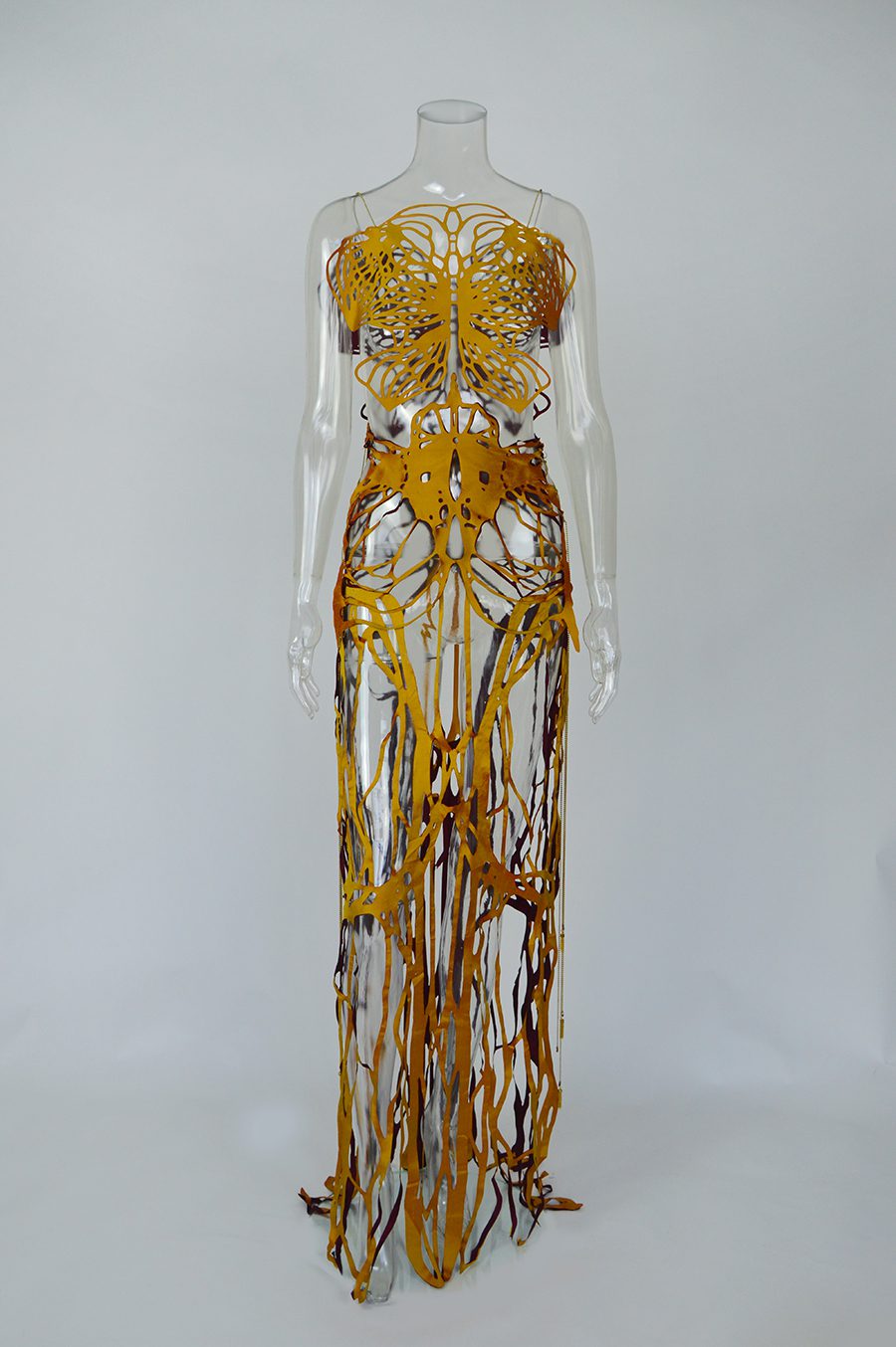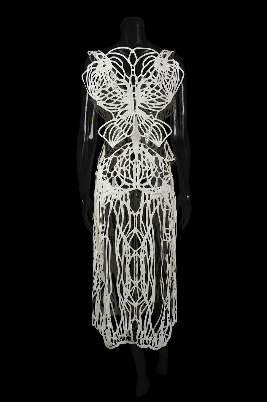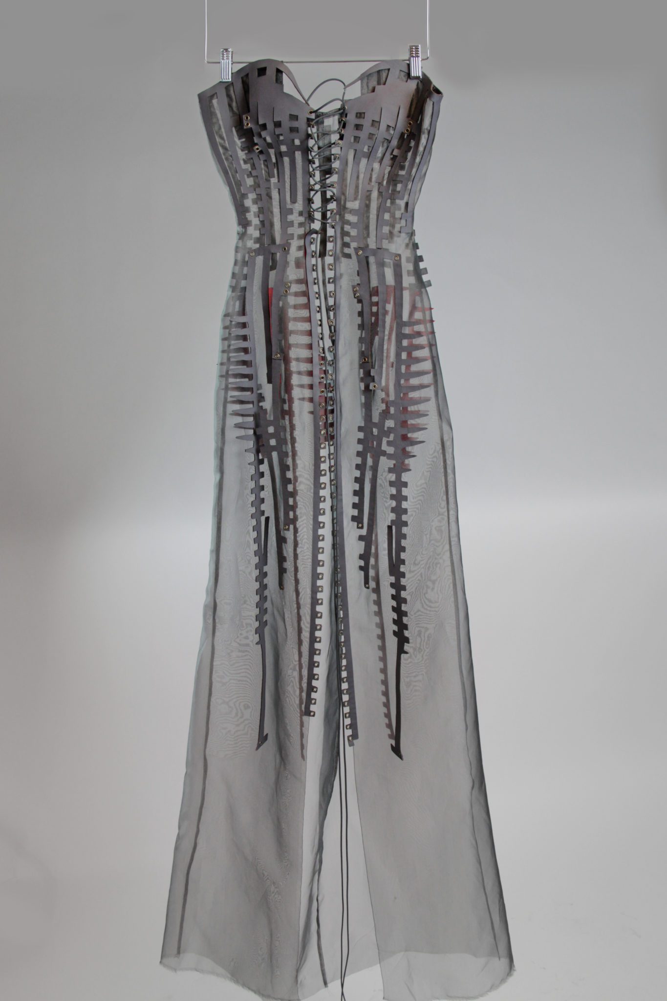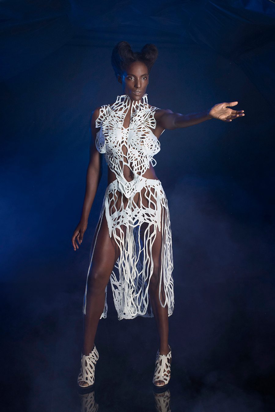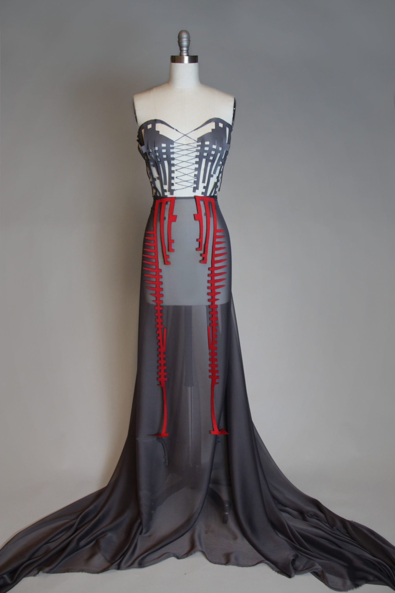 This custom couture laser-cut gown was made using 3D scanning to create a custom fit pattern, advanced fashion pattern making in 3D digital environments into real-world soft goods, and low-waste manufacturing techniques.