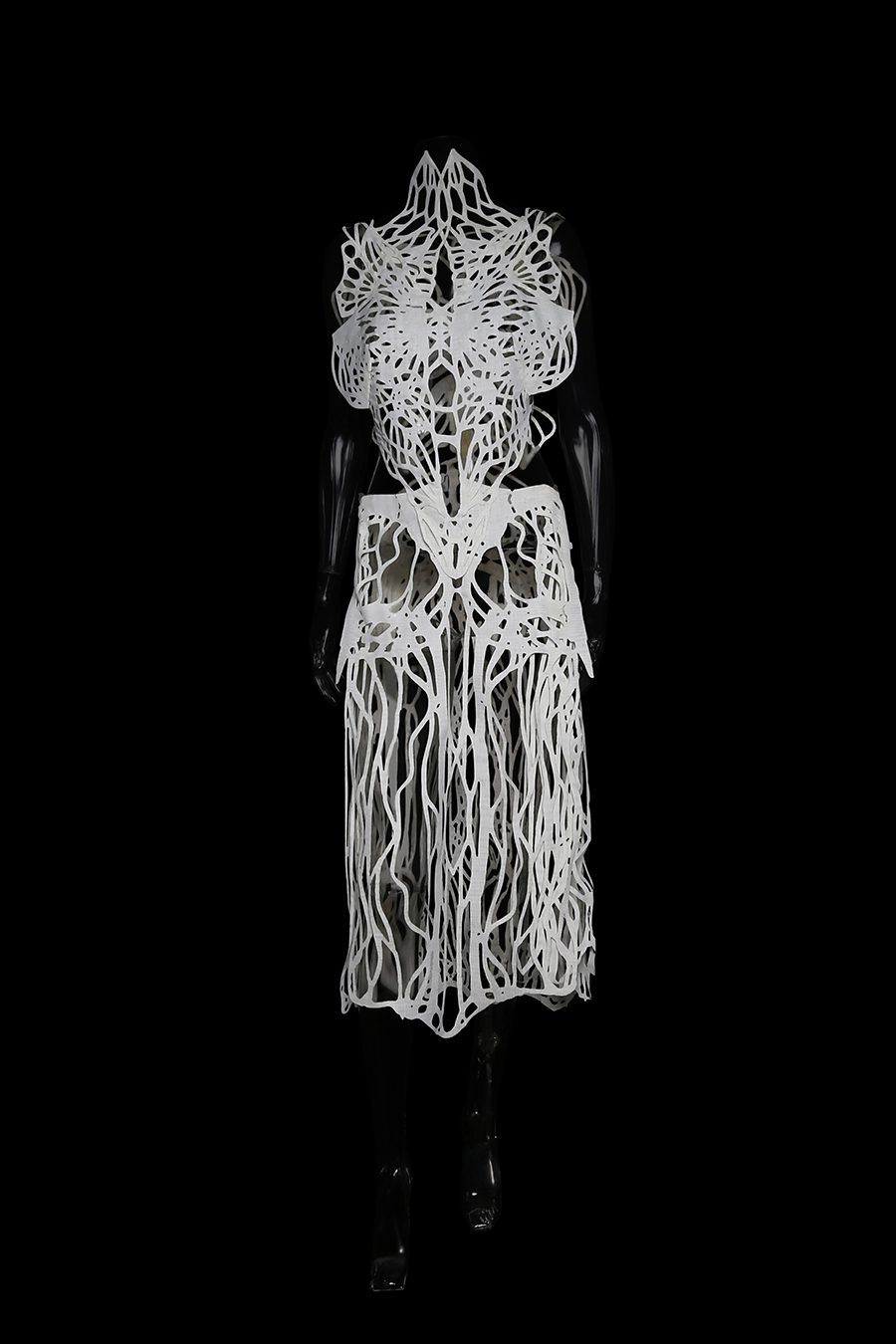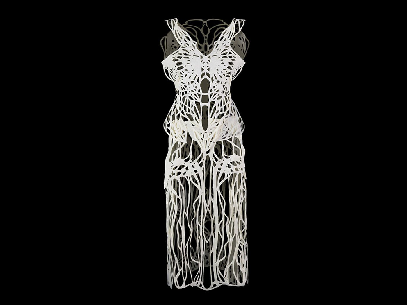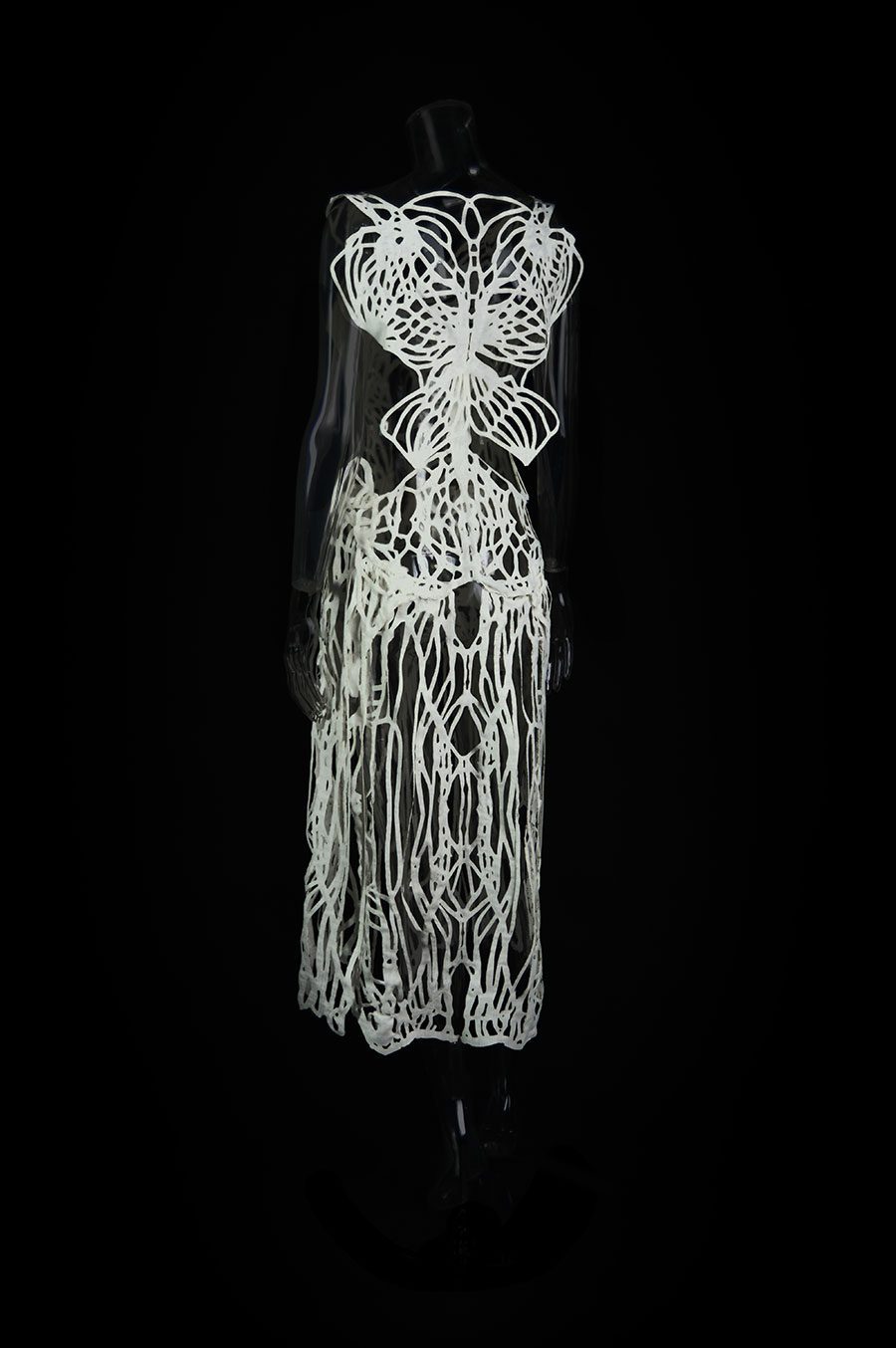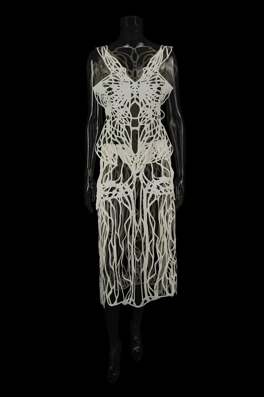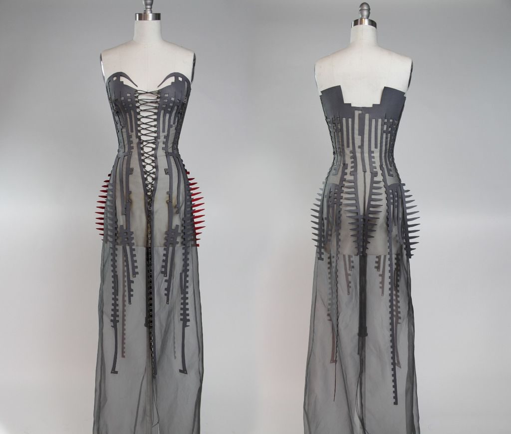This custom couture laser-cut gown was made using 3D scanning to create a custom fit pattern, advanced fashion pattern making in 3D digital environments into real-world soft goods, and low-waste manufacturing techniques.