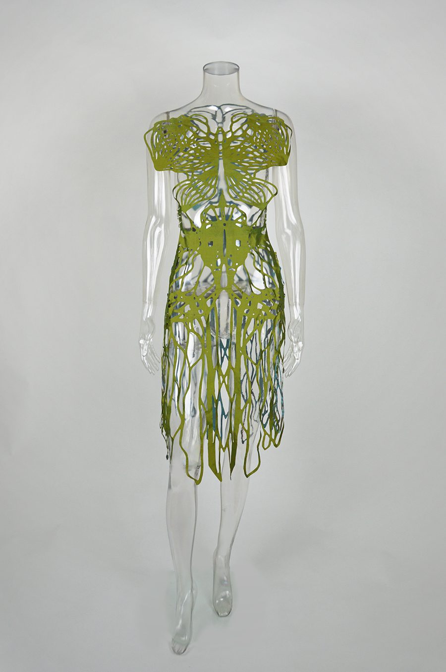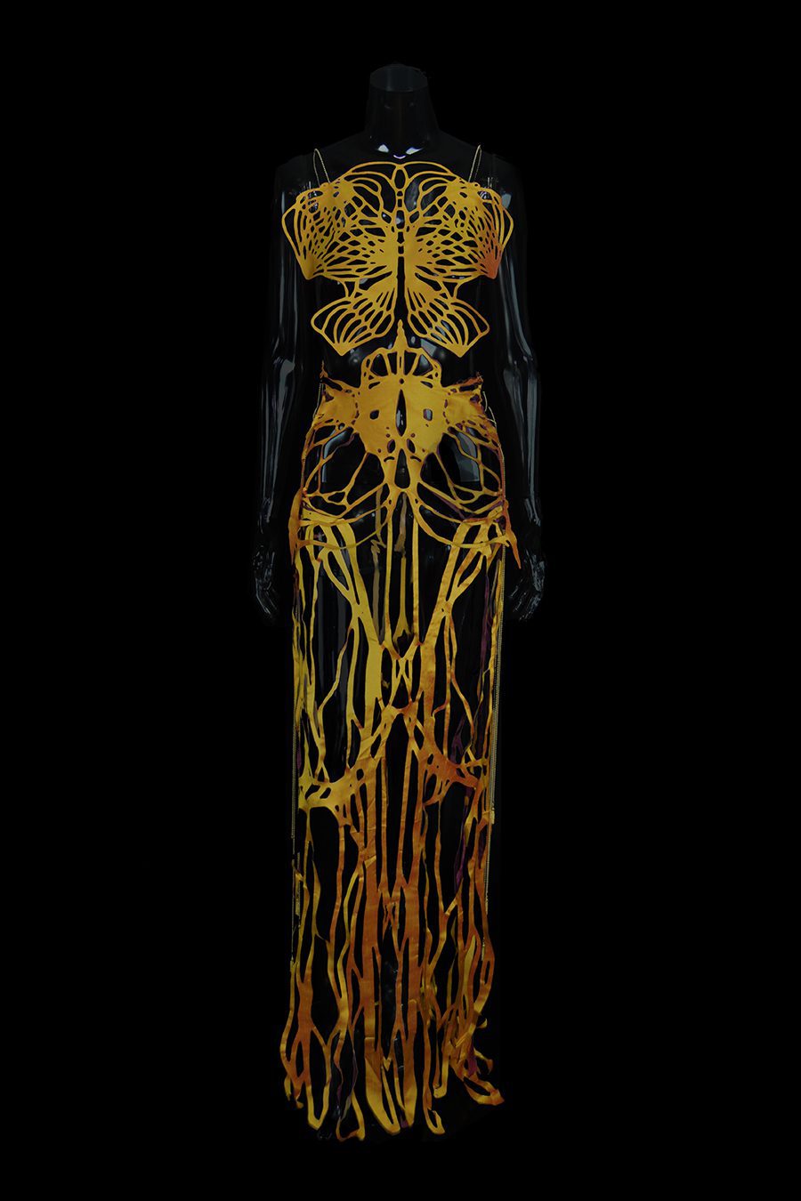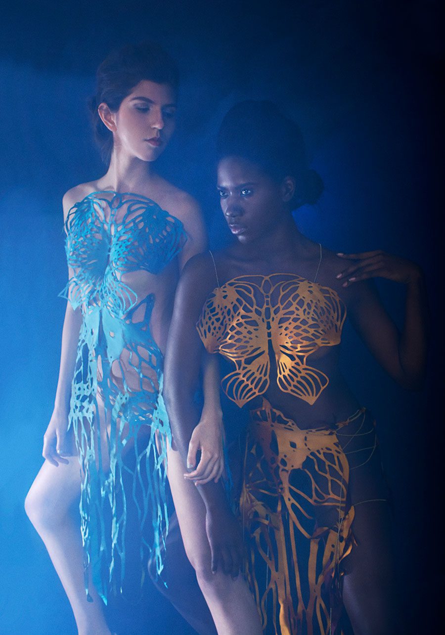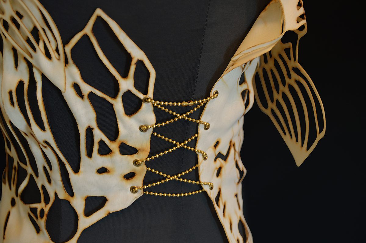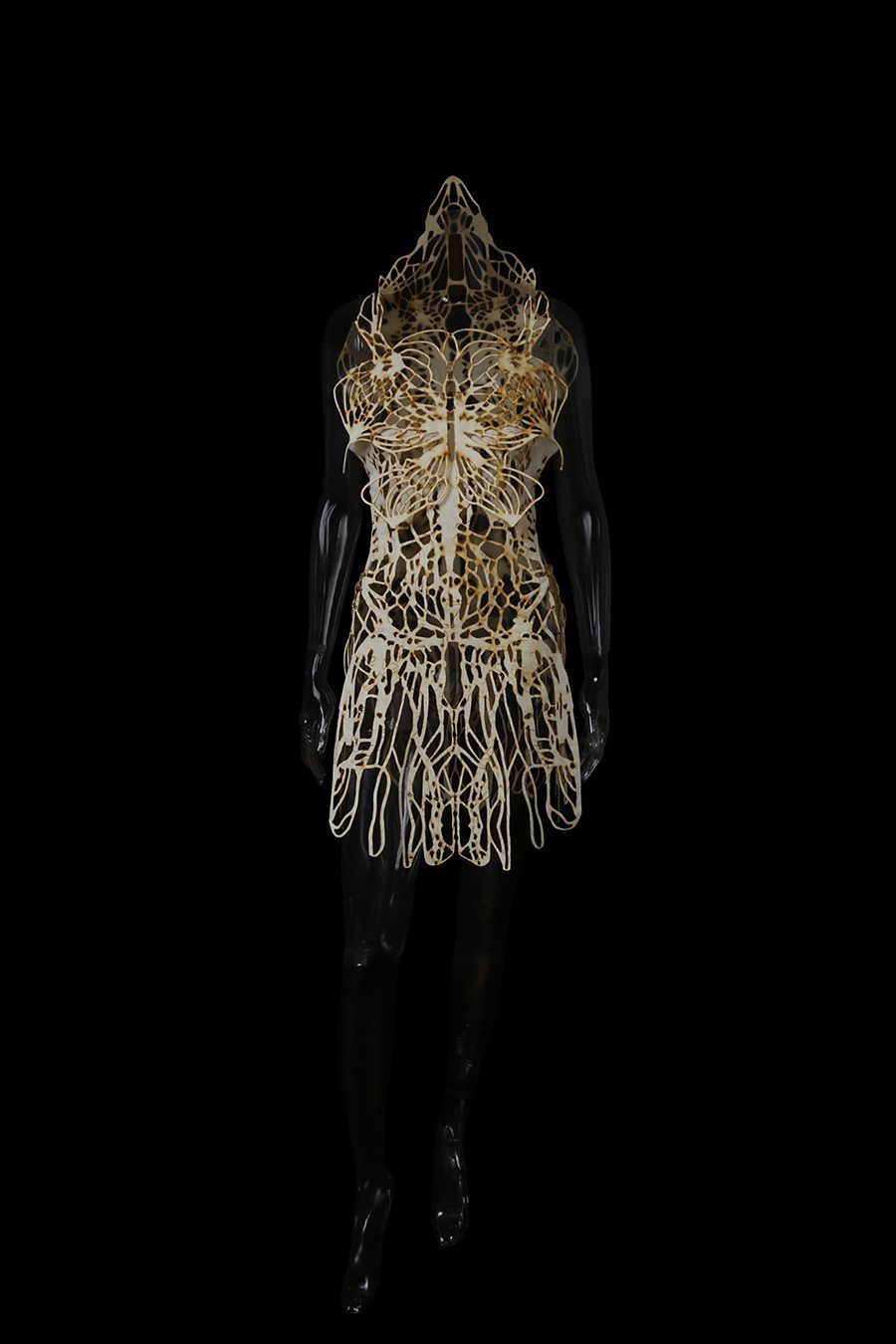 This custom couture laser-cut gown was made using 3D scanning to create a custom fit pattern, advanced fashion pattern making in 3D digital environments into real-world soft goods, and low-waste manufacturing techniques.