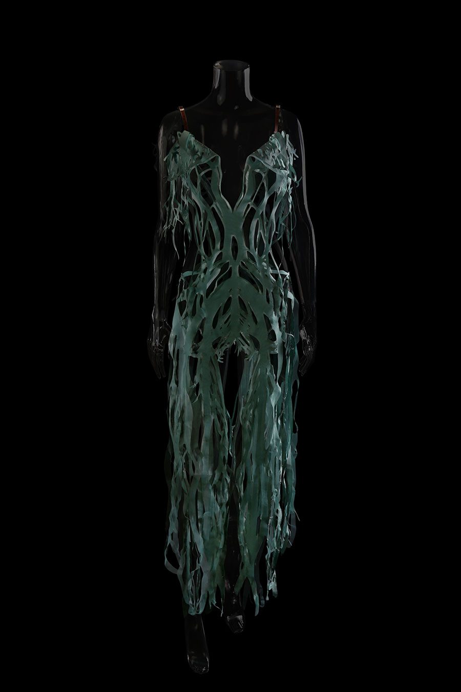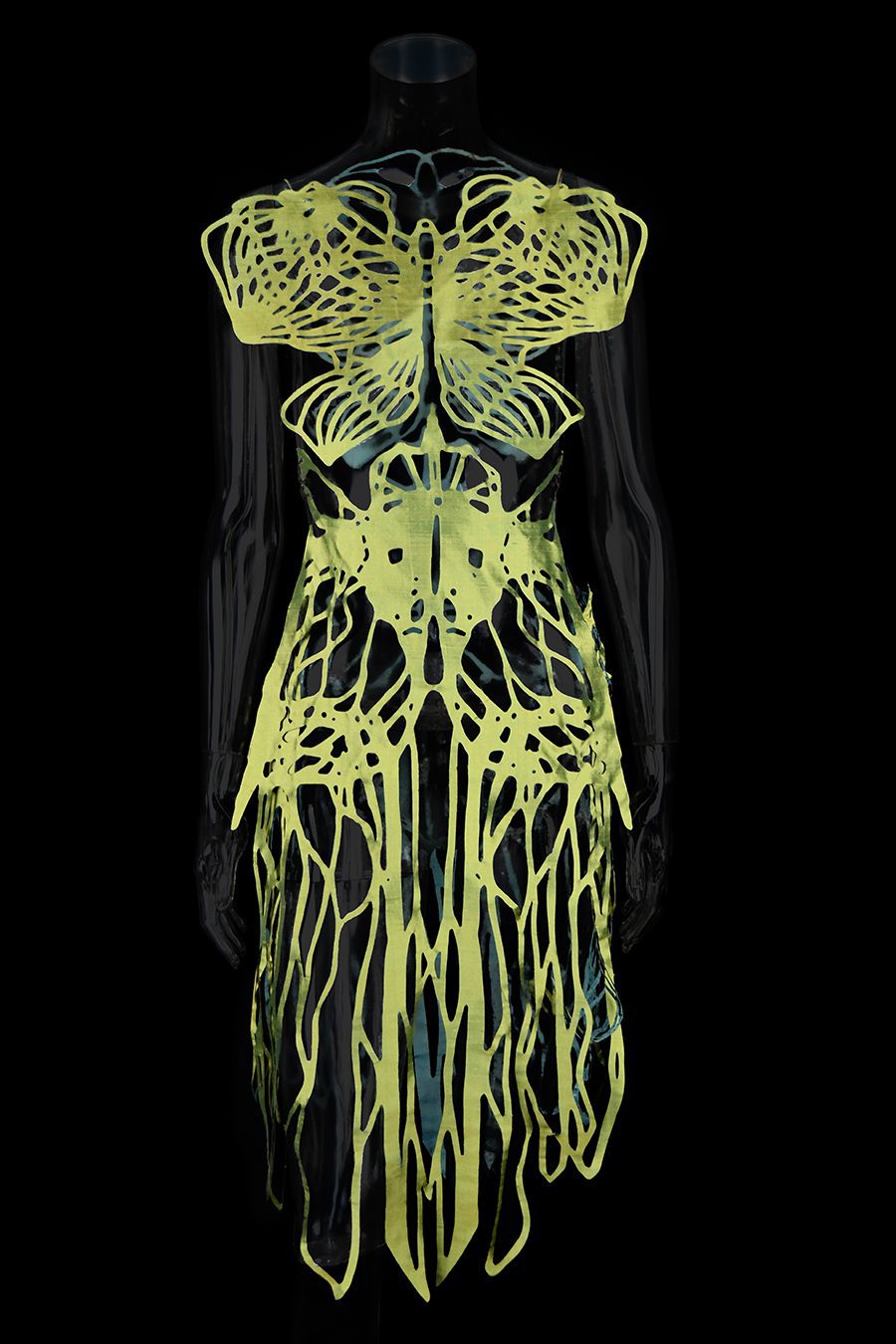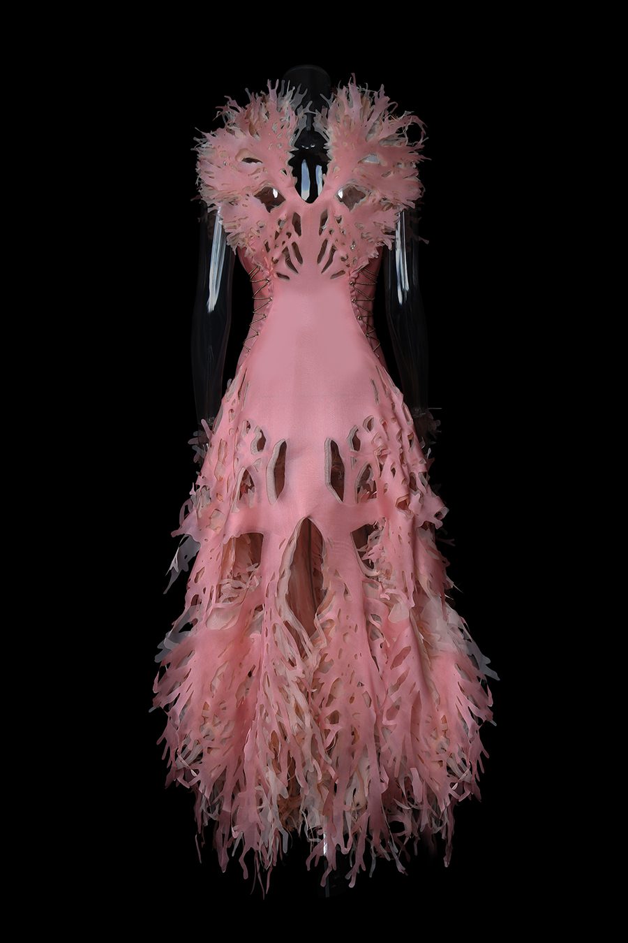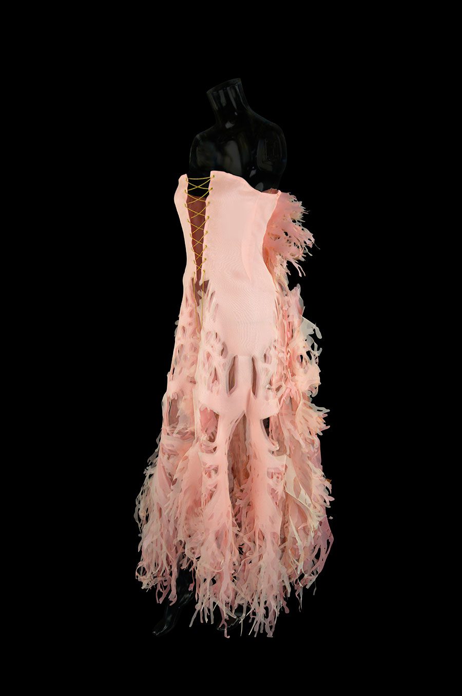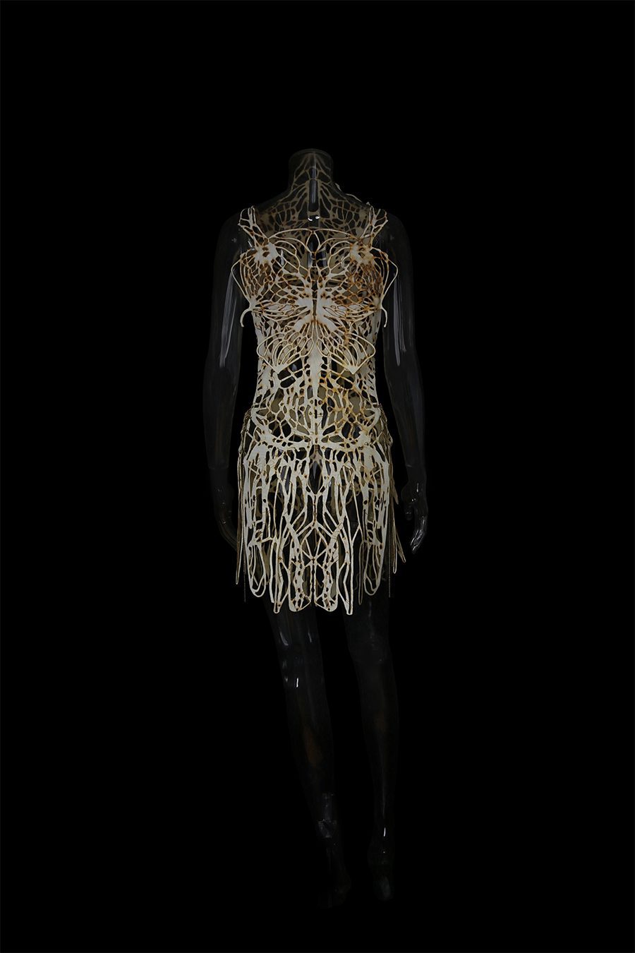 This custom couture laser-cut gown was made using 3D scanning to create a custom fit pattern, advanced fashion pattern making in 3D digital environments into real-world soft goods, and low-waste manufacturing techniques.