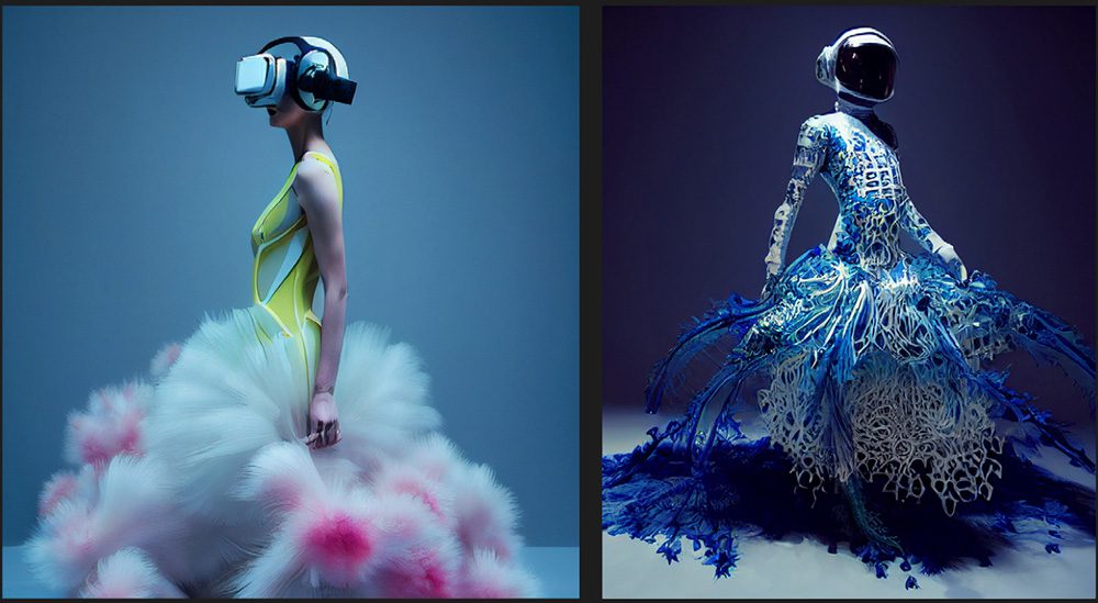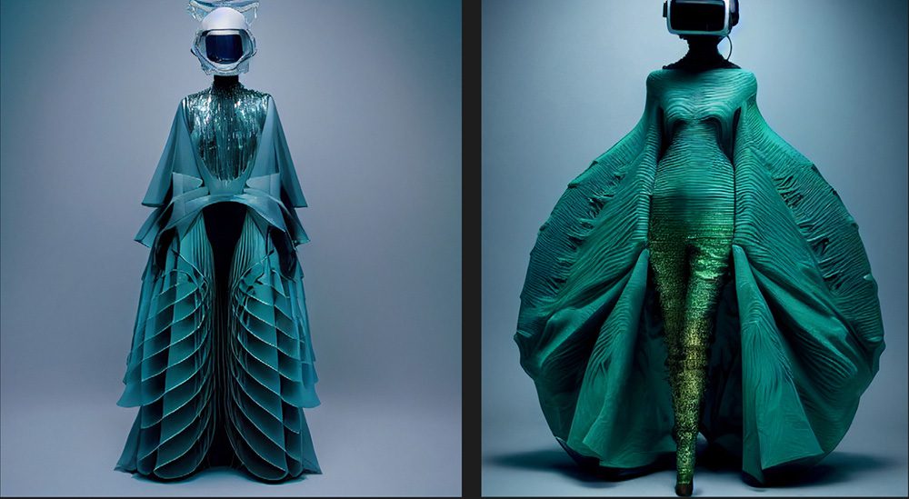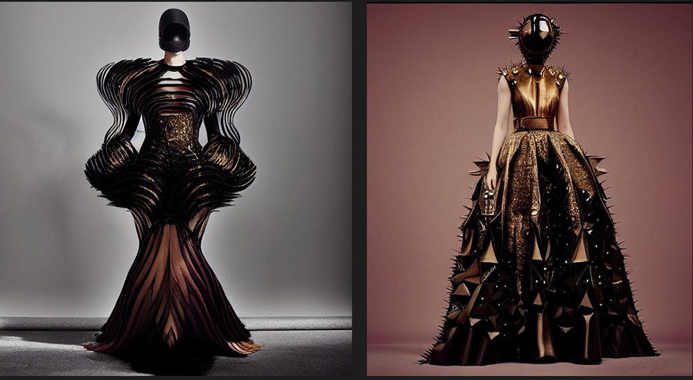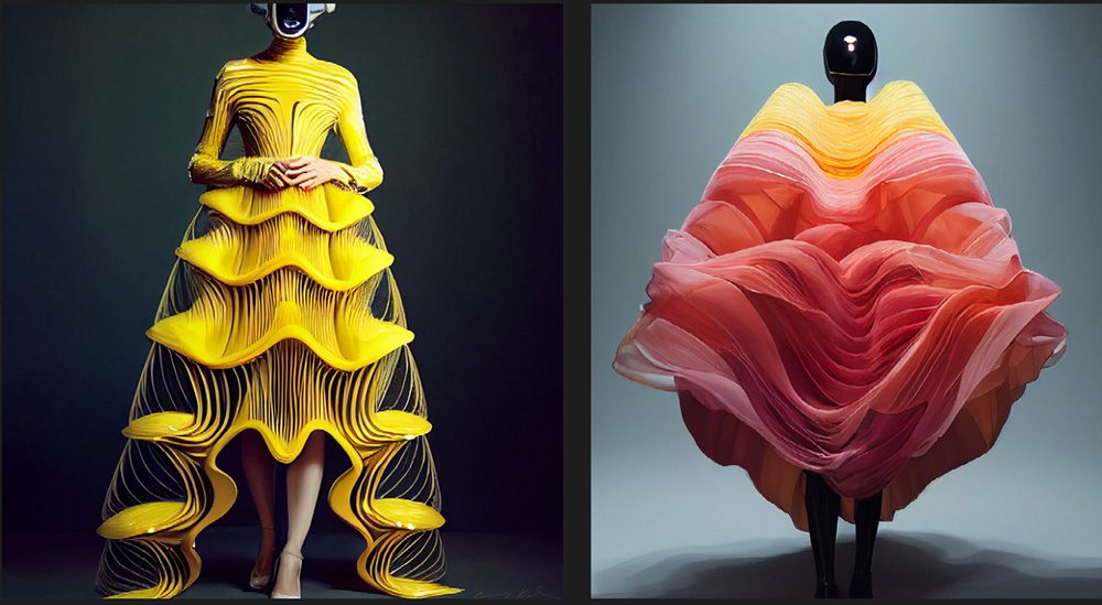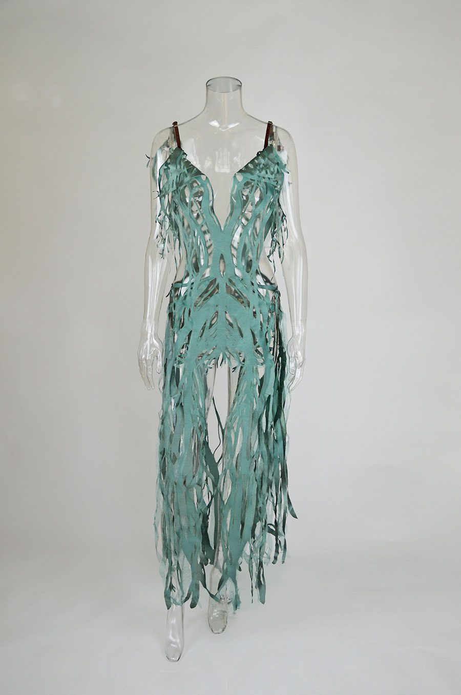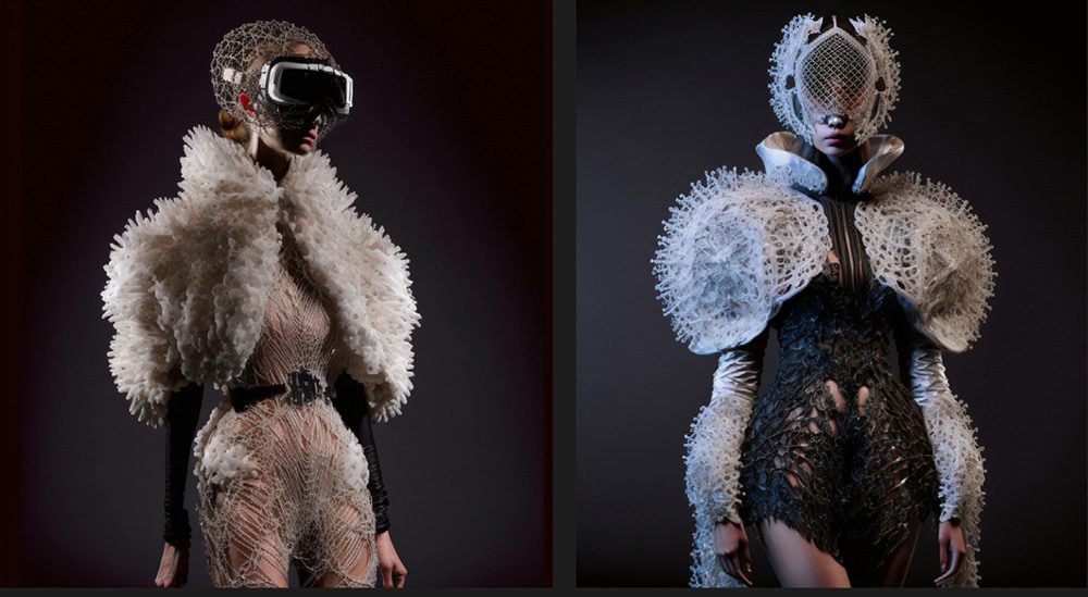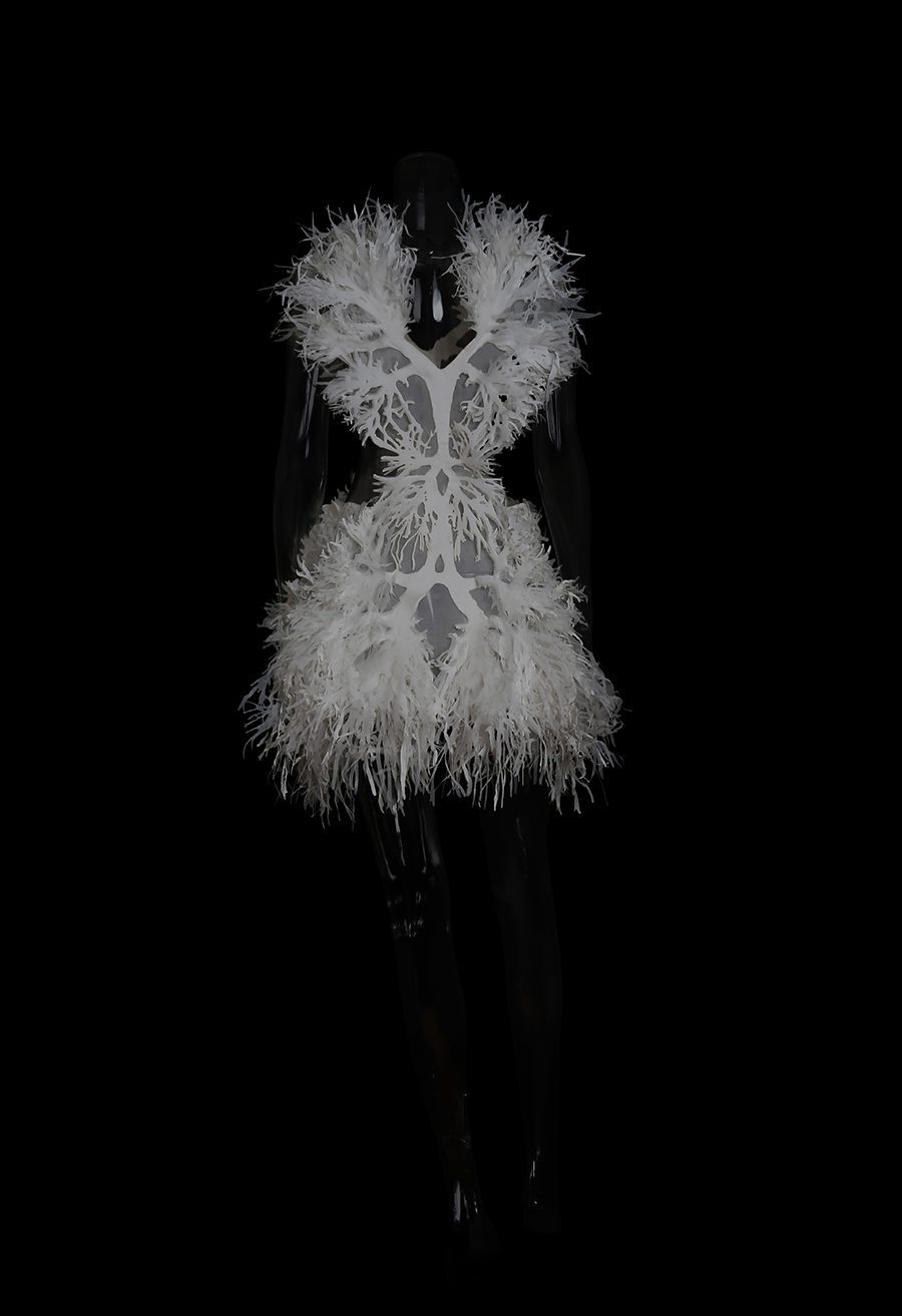 This custom couture laser-cut gown was made using 3D scanning to create a custom fit pattern, advanced fashion pattern making in 3D digital environments into real-world soft goods, and low-waste manufacturing techniques.