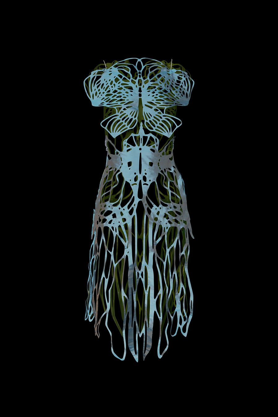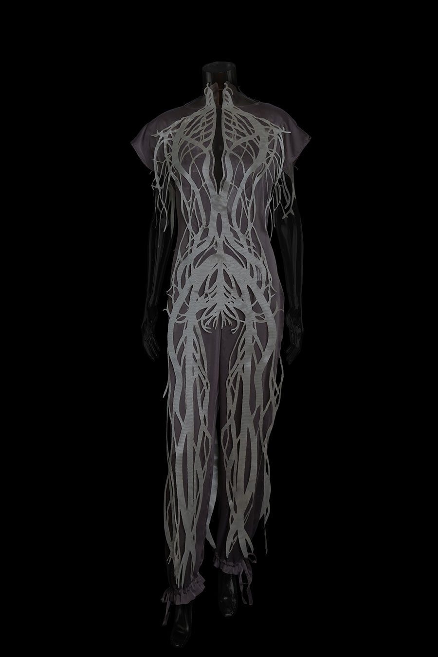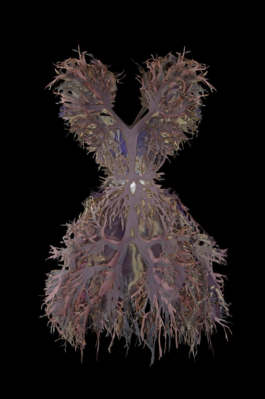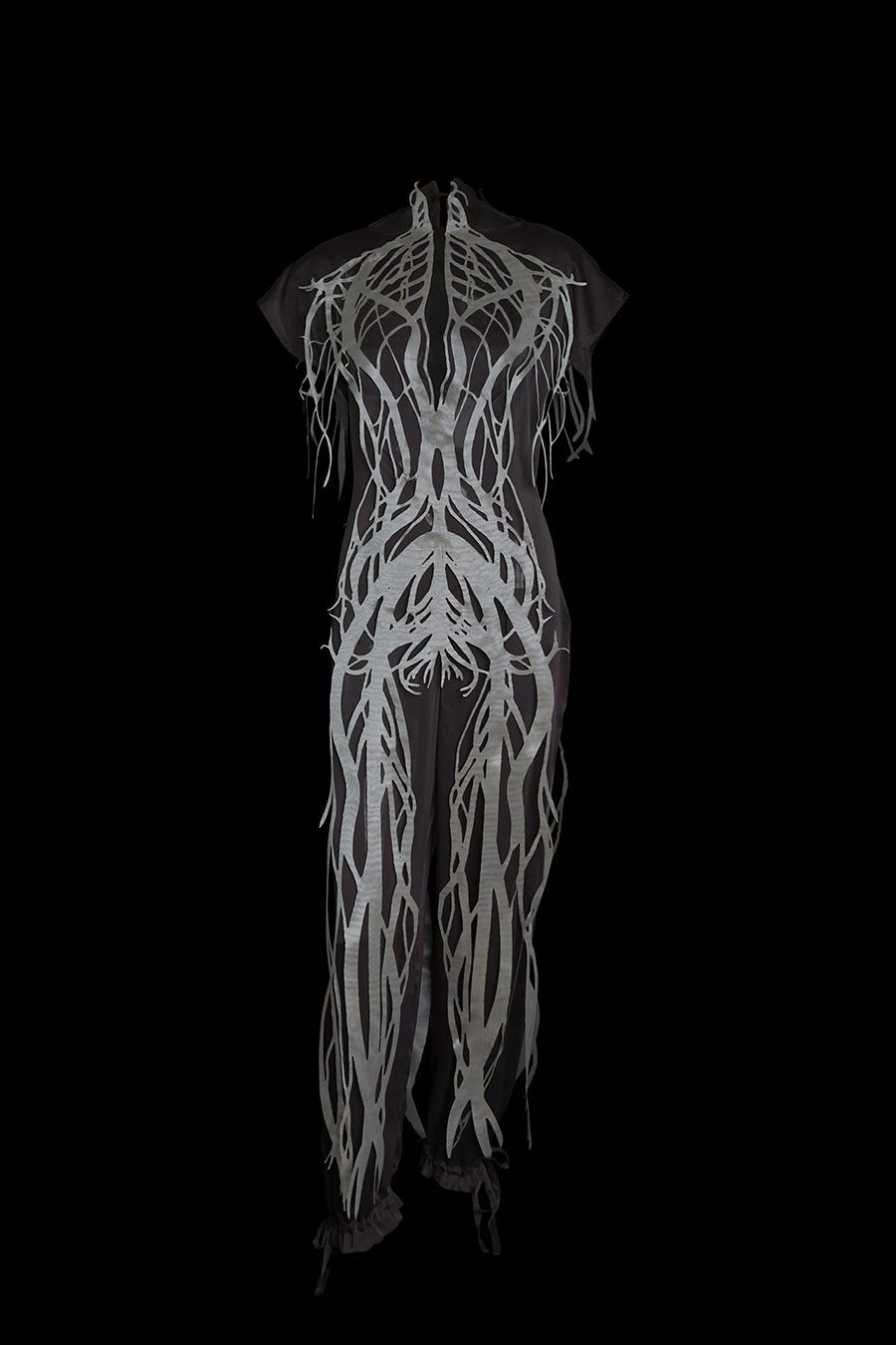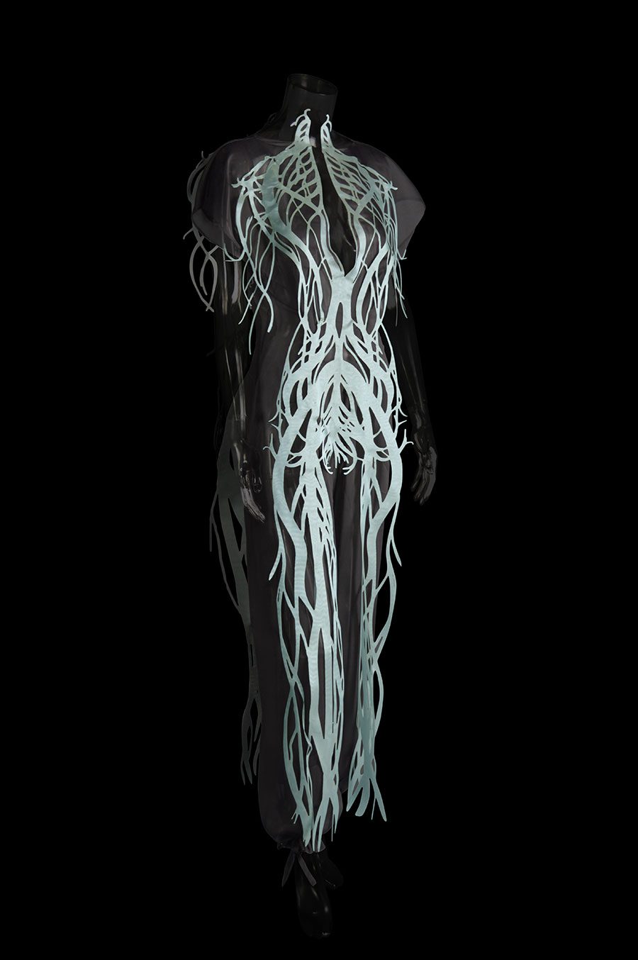 Amy Karle is an artist who uses the mind, body, science and technology to create art. Karle’s artwork taps our ideas of what it means to be human and in this body, expressing internal, ephemeral experiences in visual forms. Working across a variety of platforms she engages questions about what it means to be human by creating projects on, around, or about the body; it is the subject and the medium. Garments based on anatomy Amy Karle, 2016 Silk, polyester, cotton, natural and synthetic fibers. Wearable art garments inspired by the human nervous system, lung, and ligaments. Merging anatomy, fashion, and technology, the pieces are each created in a different method incorporating reality capture, 3D scans of the body, anatomical style drawings into digital designs (CAD), laser cut pattern pieces and finally hand and machine sewn garments. Each design had a unique approach. The “Breathe” lung dress and jumpsuit based on the nervous system was created from anatomical style drawings hand drawn by the artist then rendered into a pattern in the CAD modeling environment; the dress inspired by ligaments was derived from Verlan Dress from New Skins with Francis Bitonti Studio workshop at the Digital Arts and Humanities Research Centre of the Pratt Institute in New York that wrapped form around the body in 3D digital environment which the artist custom fit to a 3D body scan and flattened into flat pattern pieces in order to laser cut and construct out of soft material. In the process of making these pieces, Artist Amy Karle addresses current industrial challenges of: utilizing 3D scanning to create custom fit patterns and garments, unwrapping and flattening complex CAD patterns in the digital environment, advanced pattern making in 3D digital environments into real-world soft goods, and creating zero and low-waste fashion designs.