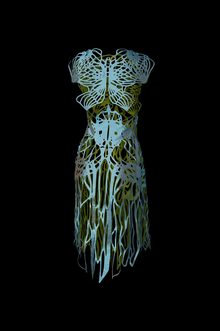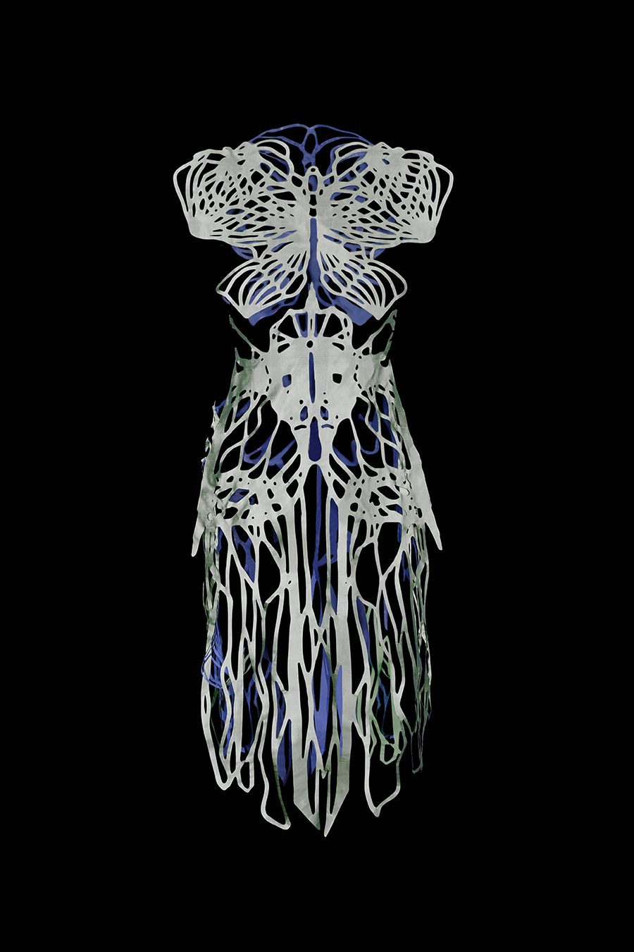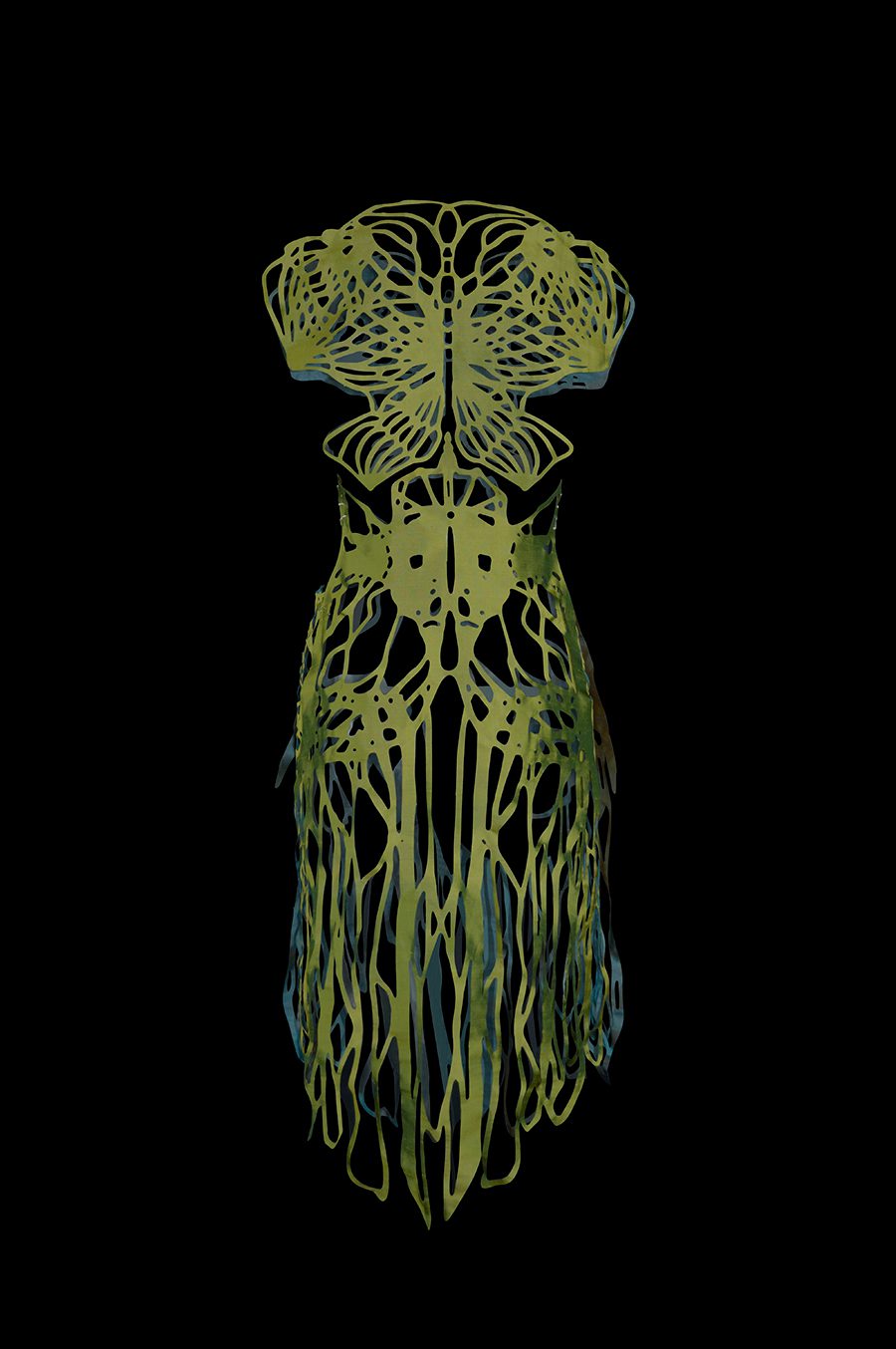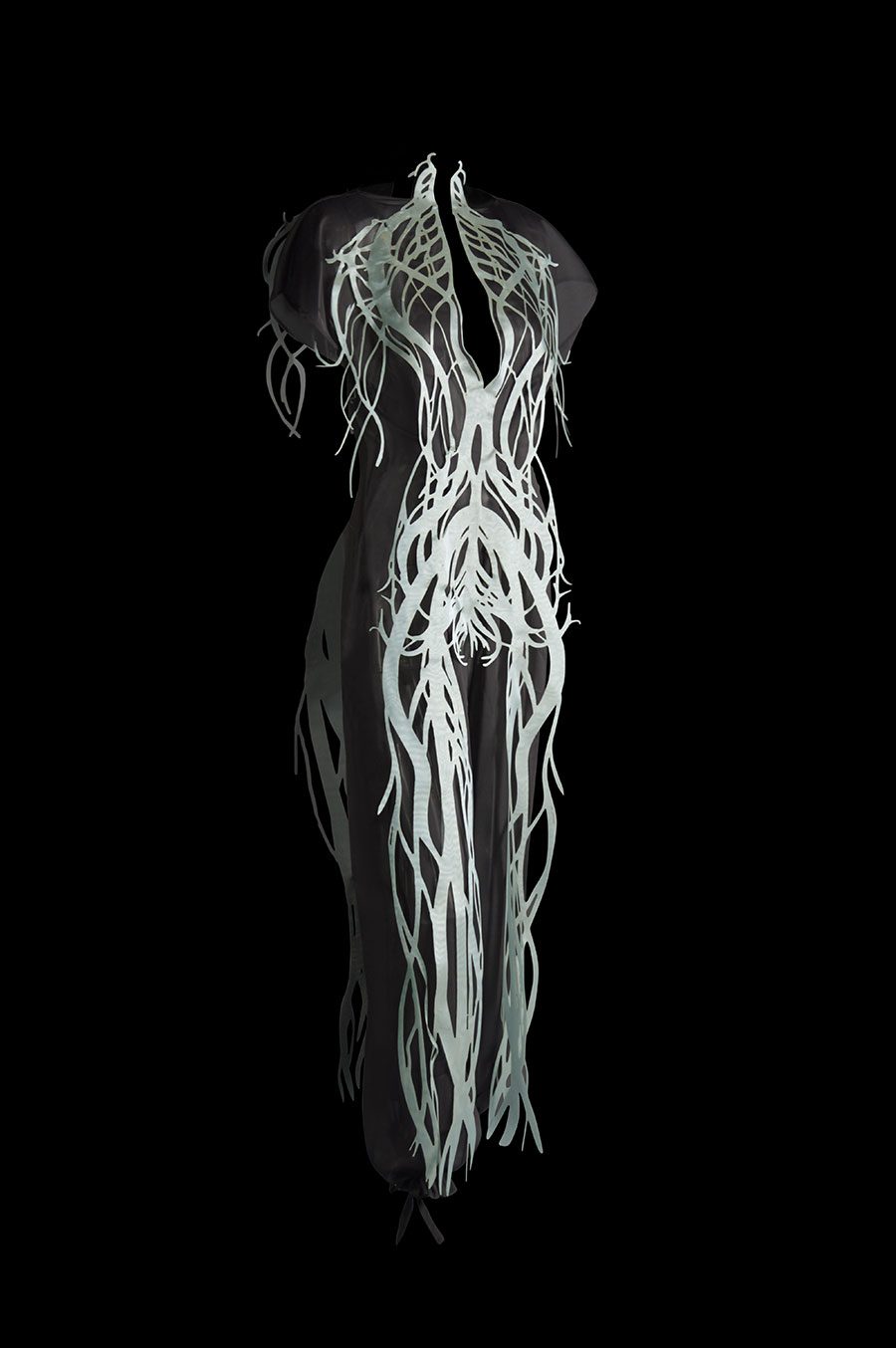 Amy Karle is an artist who uses the mind, body, science and technology to create art. Karle’s artwork taps our ideas of what it means to be human and in this body, expressing internal, ephemeral experiences in visual forms. Working across a variety of platforms she engages questions about what it means to be human by creating projects on, around, or about the body; it is the subject and the medium. Garments based on anatomy Amy Karle, 2016 Silk, polyester, cotton, natural and synthetic fibers. Wearable art garments inspired by the human nervous system, lung, and ligaments. Merging anatomy, fashion, and technology, the pieces are each created in a different method incorporating reality capture, 3D scans of the body, anatomical style drawings into digital designs (CAD), laser cut pattern pieces and finally hand and machine sewn garments. Each design had a unique approach. The “Breathe” lung dress and jumpsuit based on the nervous system was created from anatomical style drawings hand drawn by the artist then rendered into a pattern in the CAD modeling environment; the dress inspired by ligaments was derived from Verlan Dress from New Skins with Francis Bitonti Studio workshop at the Digital Arts and Humanities Research Centre of the Pratt Institute in New York that wrapped form around the body in 3D digital environment which the artist custom fit to a 3D body scan and flattened into flat pattern pieces in order to laser cut and construct out of soft material. In the process of making these pieces, Artist Amy Karle addresses current industrial challenges of: utilizing 3D scanning to create custom fit patterns and garments, unwrapping and flattening complex CAD patterns in the digital environment, advanced pattern making in 3D digital environments into real-world soft goods, and creating zero and low-waste fashion designs.