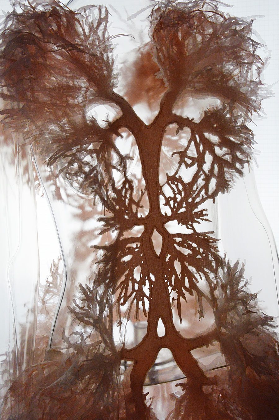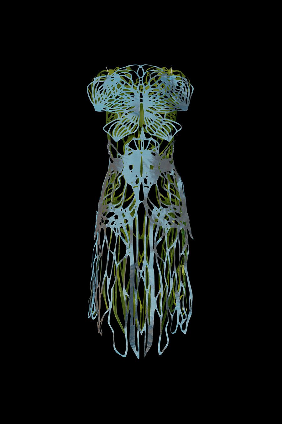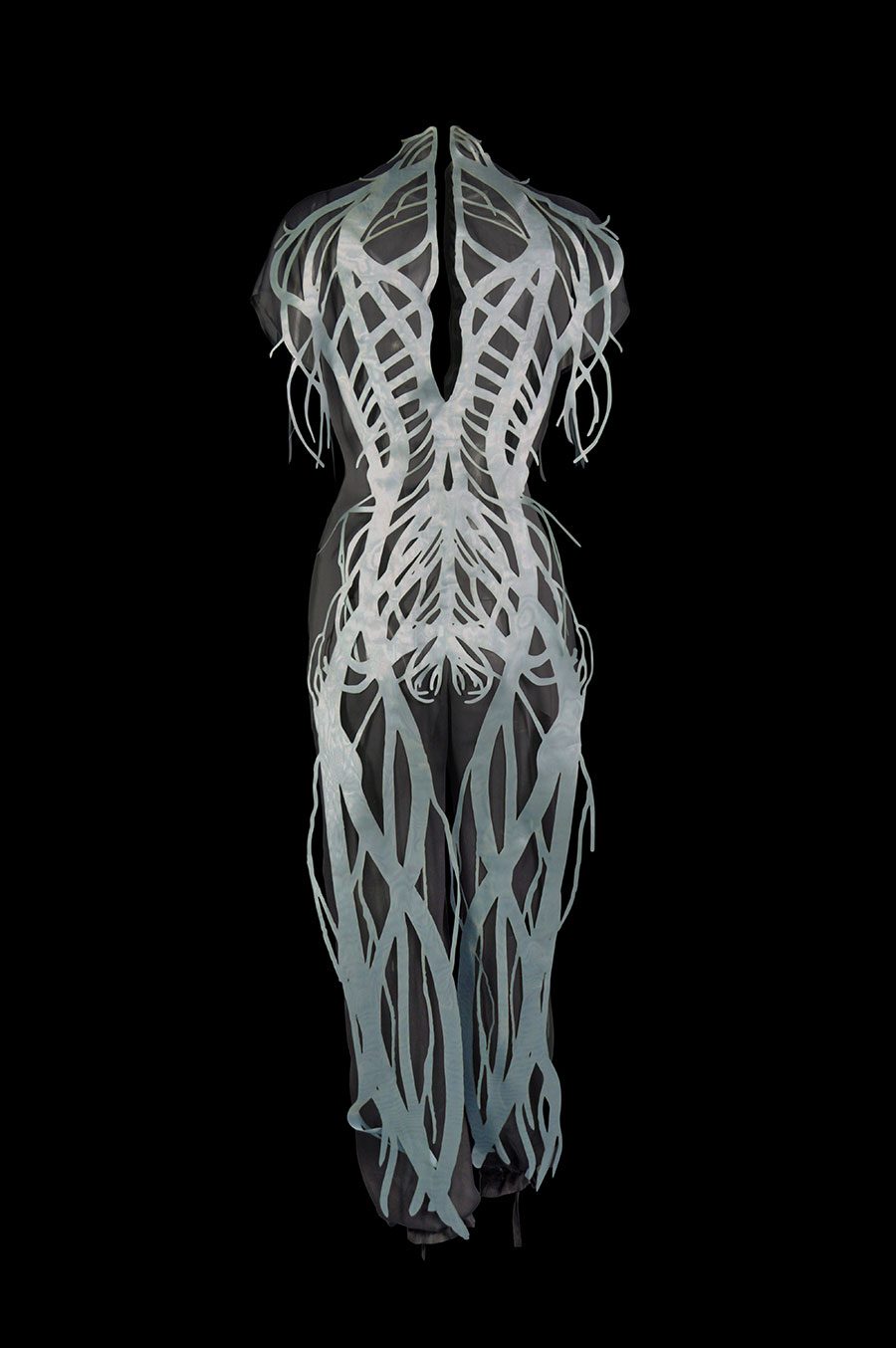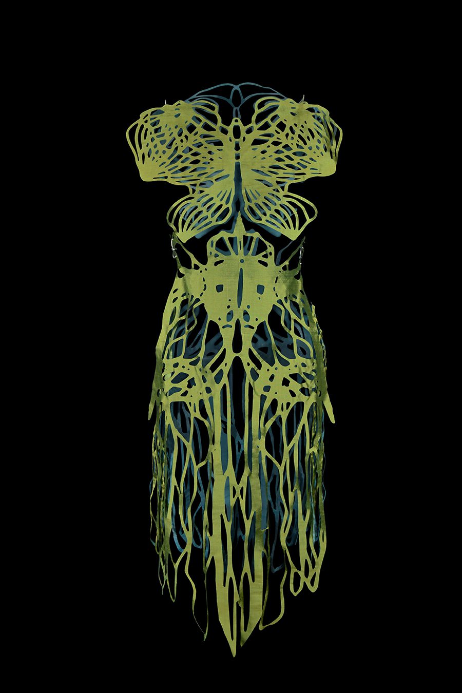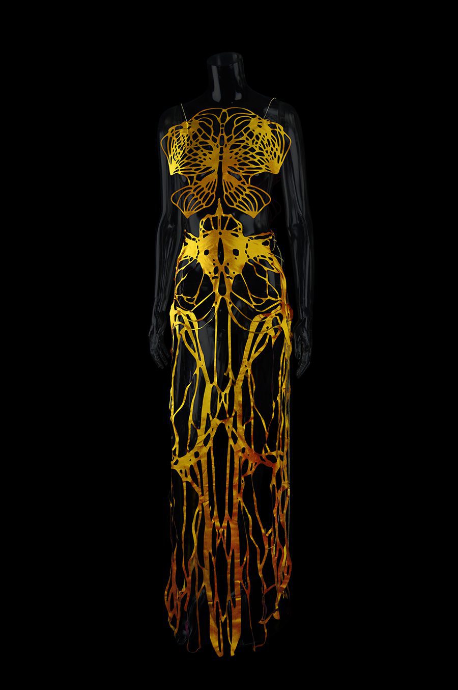 Amy Karle is an artist who uses the mind, body, science and technology to create art. Karle’s artwork taps our ideas of what it means to be human and in this body, expressing internal, ephemeral experiences in visual forms. Working across a variety of platforms she engages questions about what it means to be human by creating projects on, around, or about the body; it is the subject and the medium. Garments based on anatomy Amy Karle, 2016 Silk, polyester, cotton, natural and synthetic fibers. Wearable art garments inspired by the human nervous system, lung, and ligaments. Merging anatomy, fashion, and technology, the pieces are each created in a different method incorporating reality capture, 3D scans of the body, anatomical style drawings into digital designs (CAD), laser cut pattern pieces and finally hand and machine sewn garments. Each design had a unique approach. The “Breathe” lung dress and jumpsuit based on the nervous system was created from anatomical style drawings hand drawn by the artist then rendered into a pattern in the CAD modeling environment; the dress inspired by ligaments was derived from Verlan Dress from New Skins with Francis Bitonti Studio workshop at the Digital Arts and Humanities Research Centre of the Pratt Institute in New York that wrapped form around the body in 3D digital environment which the artist custom fit to a 3D body scan and flattened into flat pattern pieces in order to laser cut and construct out of soft material. In the process of making these pieces, Artist Amy Karle addresses current industrial challenges of: utilizing 3D scanning to create custom fit patterns and garments, unwrapping and flattening complex CAD patterns in the digital environment, advanced pattern making in 3D digital environments into real-world soft goods, and creating zero and low-waste fashion designs.