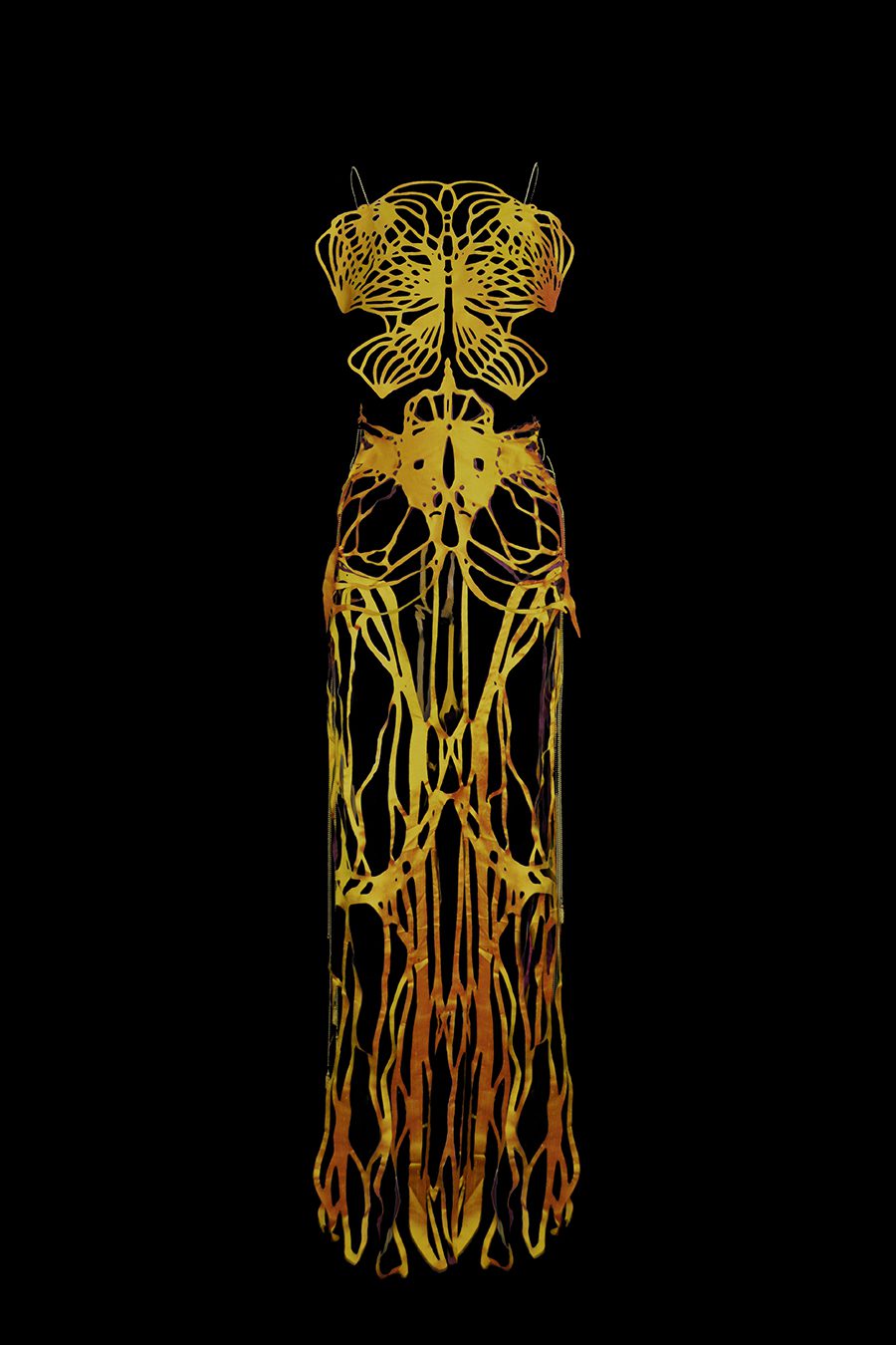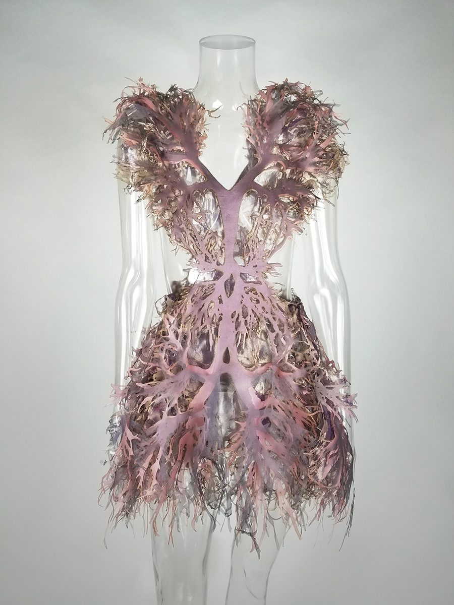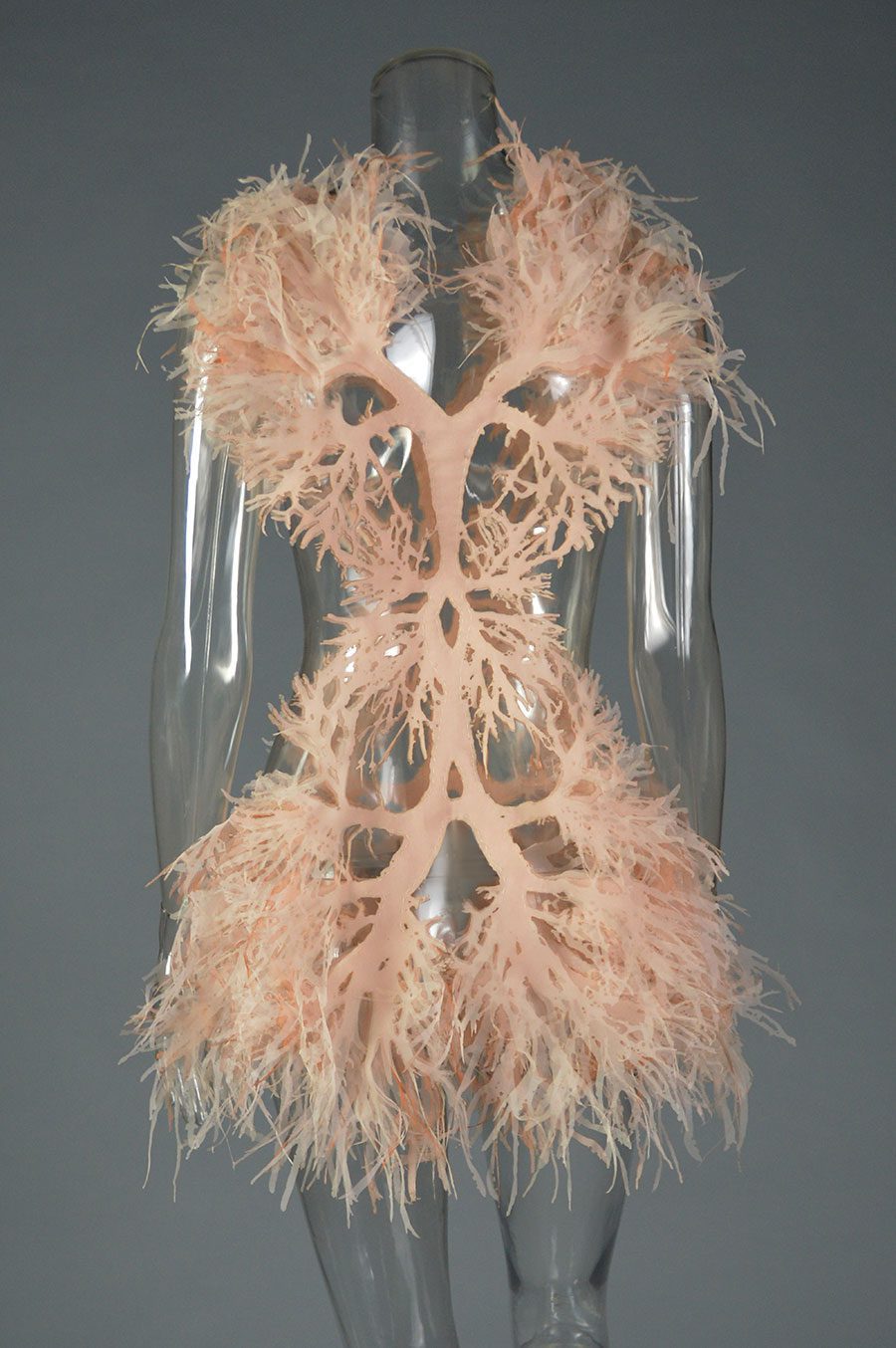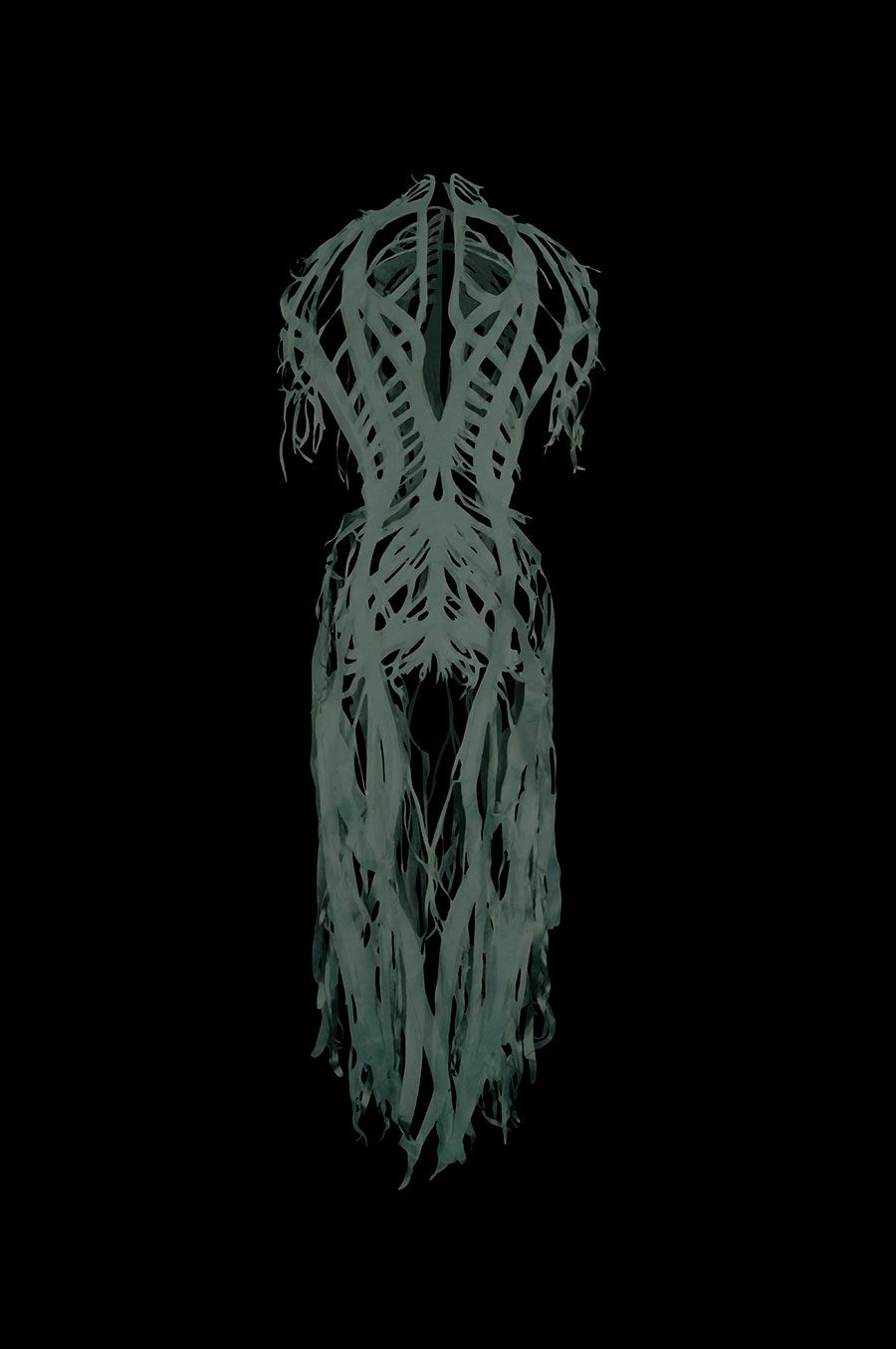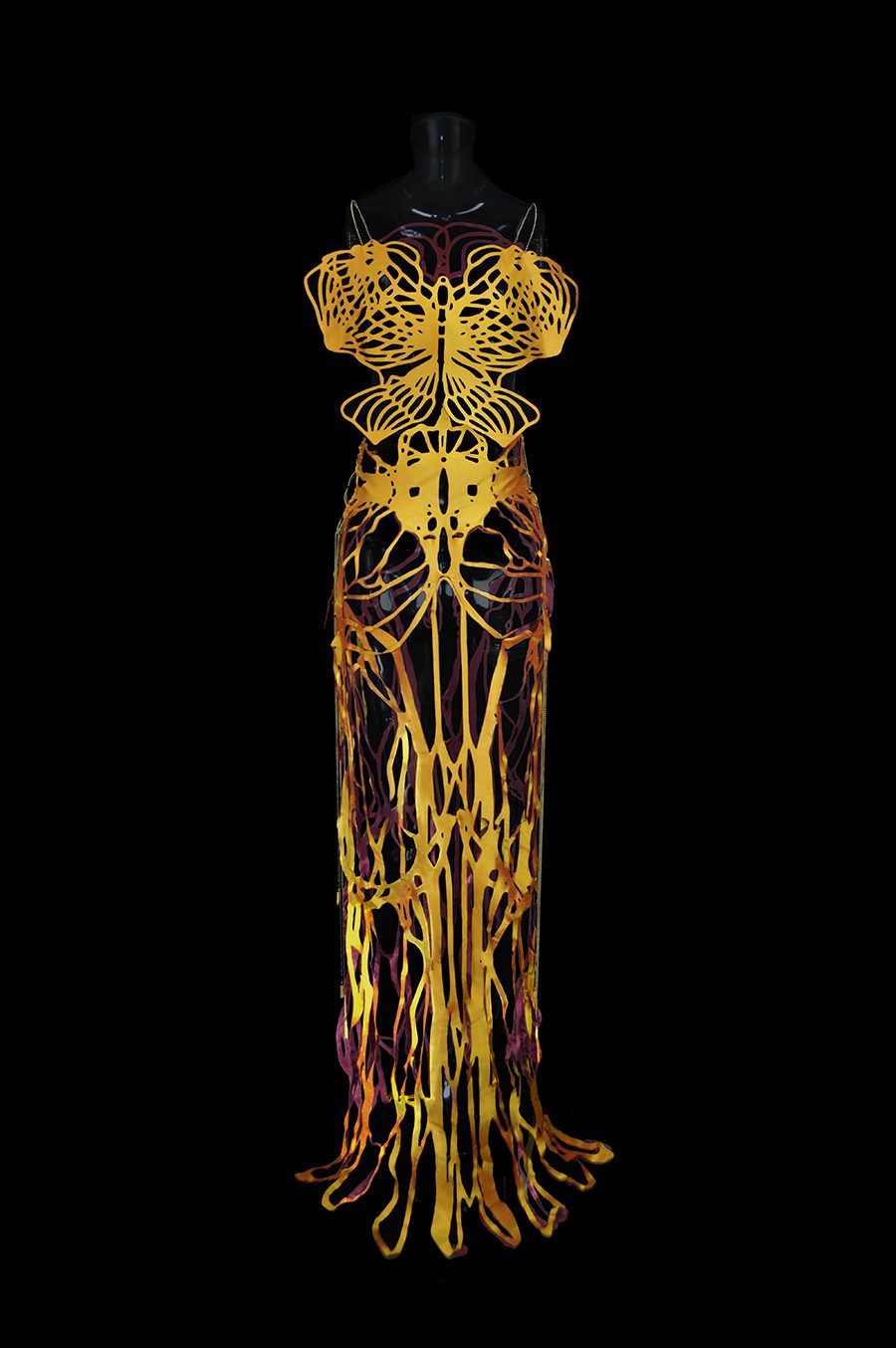 Amy Karle is an artist who uses the mind, body, science and technology to create art. Karle’s artwork taps our ideas of what it means to be human and in this body, expressing internal, ephemeral experiences in visual forms. Working across a variety of platforms she engages questions about what it means to be human by creating projects on, around, or about the body; it is the subject and the medium. Garments based on anatomy Amy Karle, 2016 Silk, polyester, cotton, natural and synthetic fibers. Wearable art garments inspired by the human nervous system, lung, and ligaments. Merging anatomy, fashion, and technology, the pieces are each created in a different method incorporating reality capture, 3D scans of the body, anatomical style drawings into digital designs (CAD), laser cut pattern pieces and finally hand and machine sewn garments. Each design had a unique approach. The “Breathe” lung dress and jumpsuit based on the nervous system was created from anatomical style drawings hand drawn by the artist then rendered into a pattern in the CAD modeling environment; the dress inspired by ligaments was derived from Verlan Dress from New Skins with Francis Bitonti Studio workshop at the Digital Arts and Humanities Research Centre of the Pratt Institute in New York that wrapped form around the body in 3D digital environment which the artist custom fit to a 3D body scan and flattened into flat pattern pieces in order to laser cut and construct out of soft material. In the process of making these pieces, Artist Amy Karle addresses current industrial challenges of: utilizing 3D scanning to create custom fit patterns and garments, unwrapping and flattening complex CAD patterns in the digital environment, advanced pattern making in 3D digital environments into real-world soft goods, and creating zero and low-waste fashion designs.