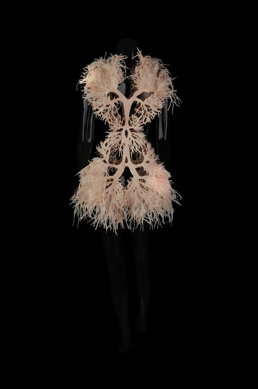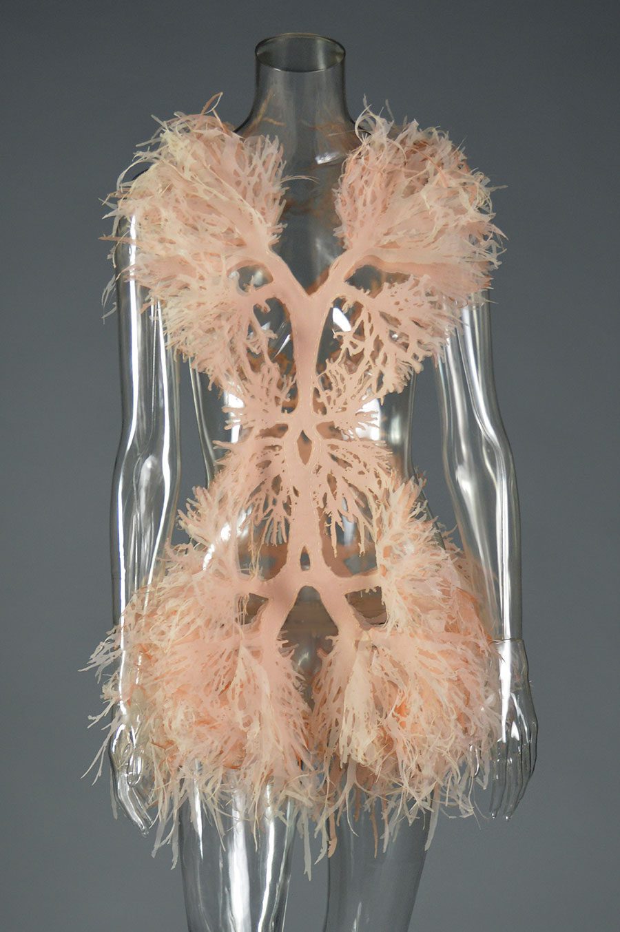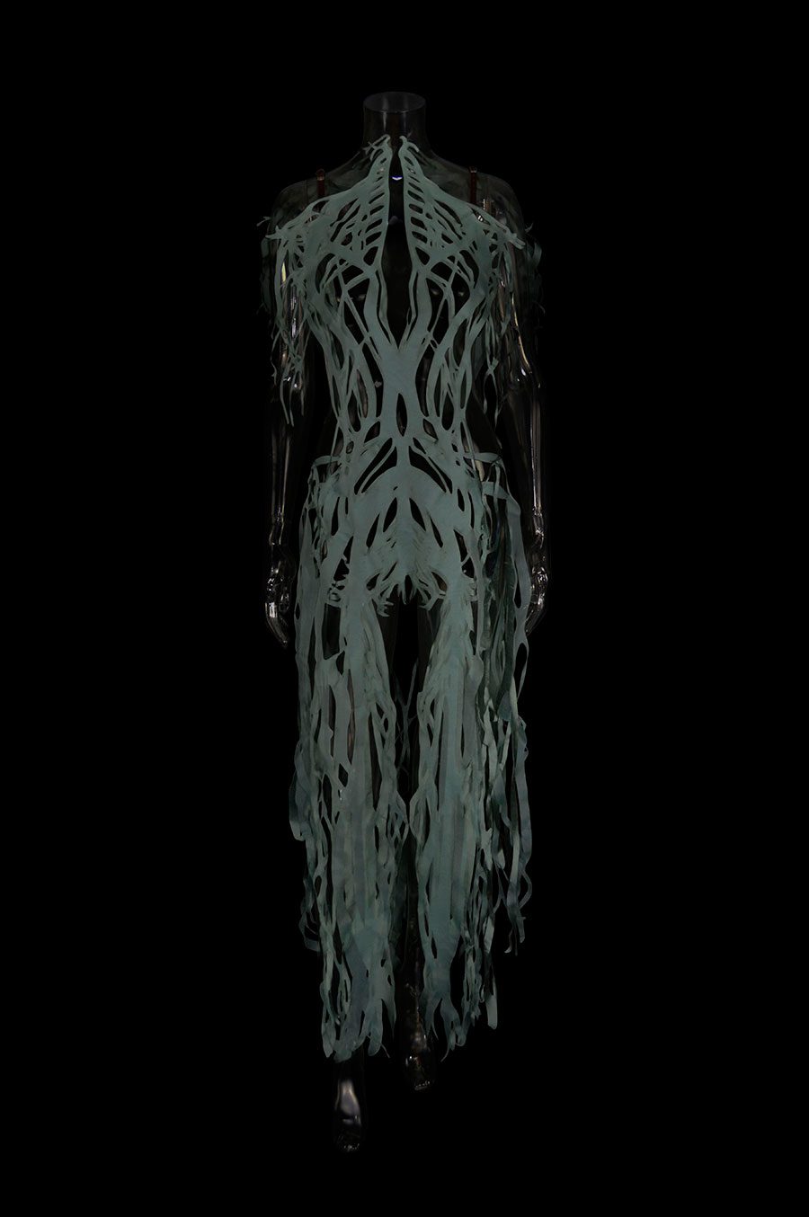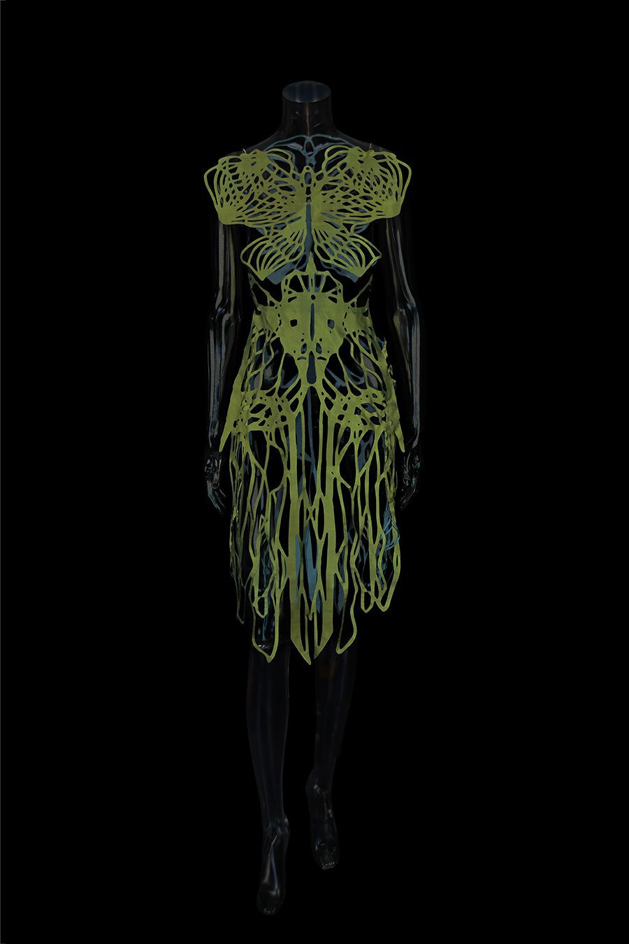 Amy Karle is an artist who uses the mind, body, science and technology to create art. Karle’s artwork taps our ideas of what it means to be human and in this body, expressing internal, ephemeral experiences in visual forms. Working across a variety of platforms she engages questions about what it means to be human by creating projects on, around, or about the body; it is the subject and the medium. Garments based on anatomy Amy Karle, 2016 Silk, polyester, cotton, natural and synthetic fibers. Wearable art garments inspired by the human nervous system, lung, and ligaments. Merging anatomy, fashion, and technology, the pieces are each created in a different method incorporating reality capture, 3D scans of the body, anatomical style drawings into digital designs (CAD), laser cut pattern pieces and finally hand and machine sewn garments. Each design had a unique approach. The “Breathe” lung dress and jumpsuit based on the nervous system was created from anatomical style drawings hand drawn by the artist then rendered into a pattern in the CAD modeling environment; the dress inspired by ligaments was derived from Verlan Dress from New Skins with Francis Bitonti Studio workshop at the Digital Arts and Humanities Research Centre of the Pratt Institute in New York that wrapped form around the body in 3D digital environment which the artist custom fit to a 3D body scan and flattened into flat pattern pieces in order to laser cut and construct out of soft material. In the process of making these pieces, Artist Amy Karle addresses current industrial challenges of: utilizing 3D scanning to create custom fit patterns and garments, unwrapping and flattening complex CAD patterns in the digital environment, advanced pattern making in 3D digital environments into real-world soft goods, and creating zero and low-waste fashion designs.