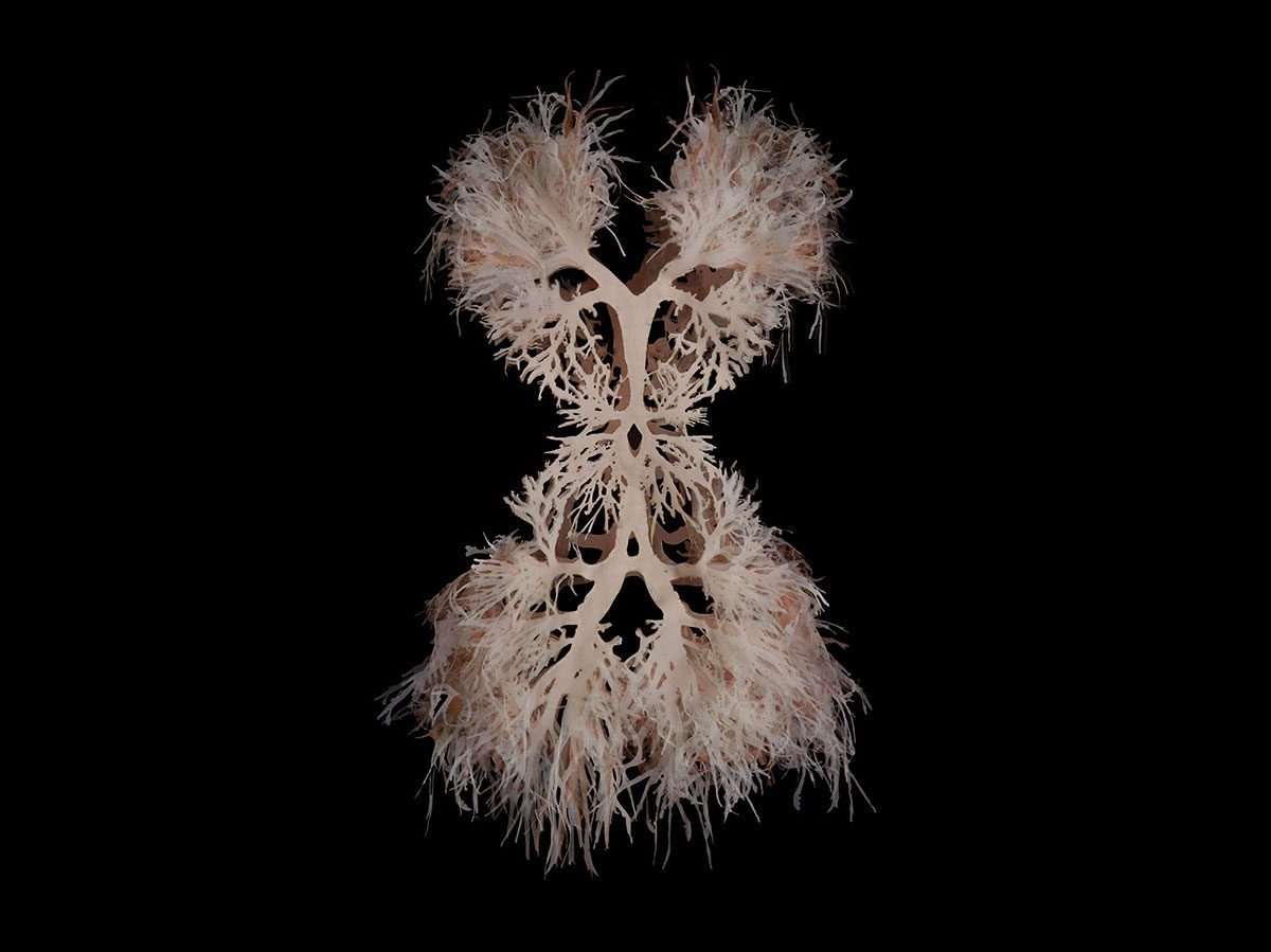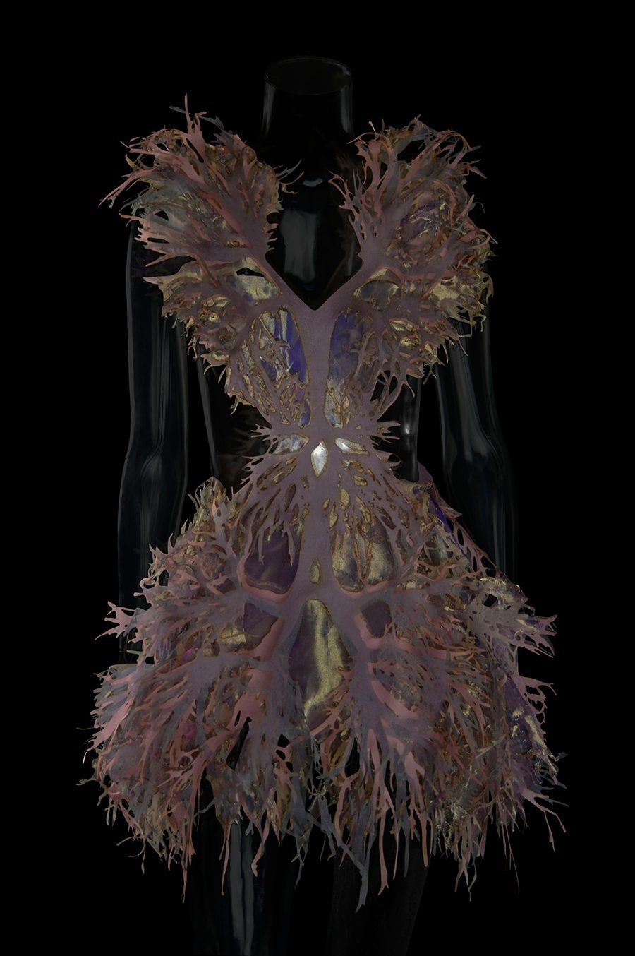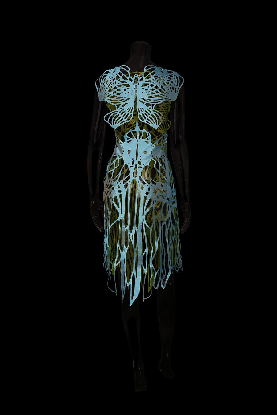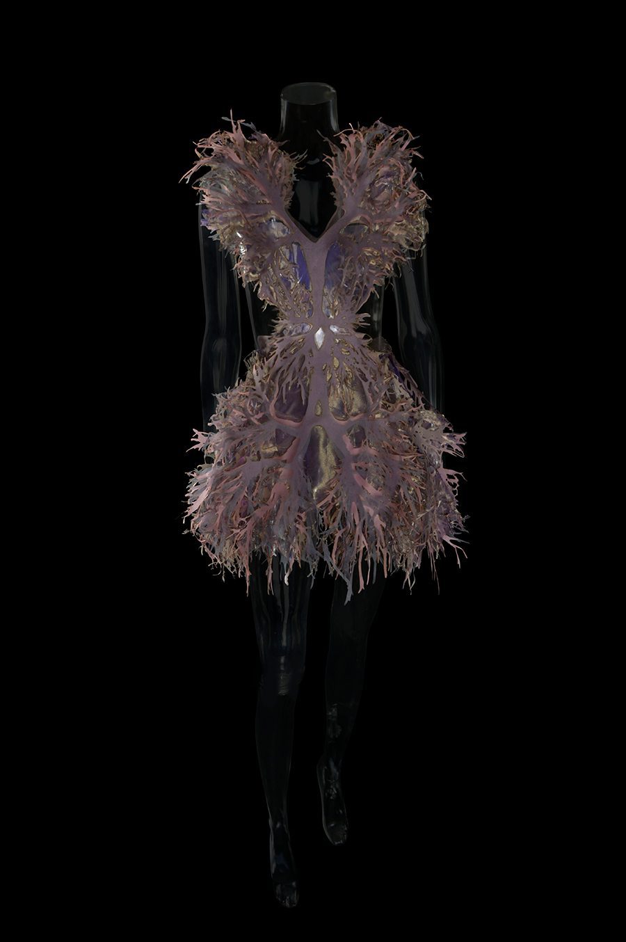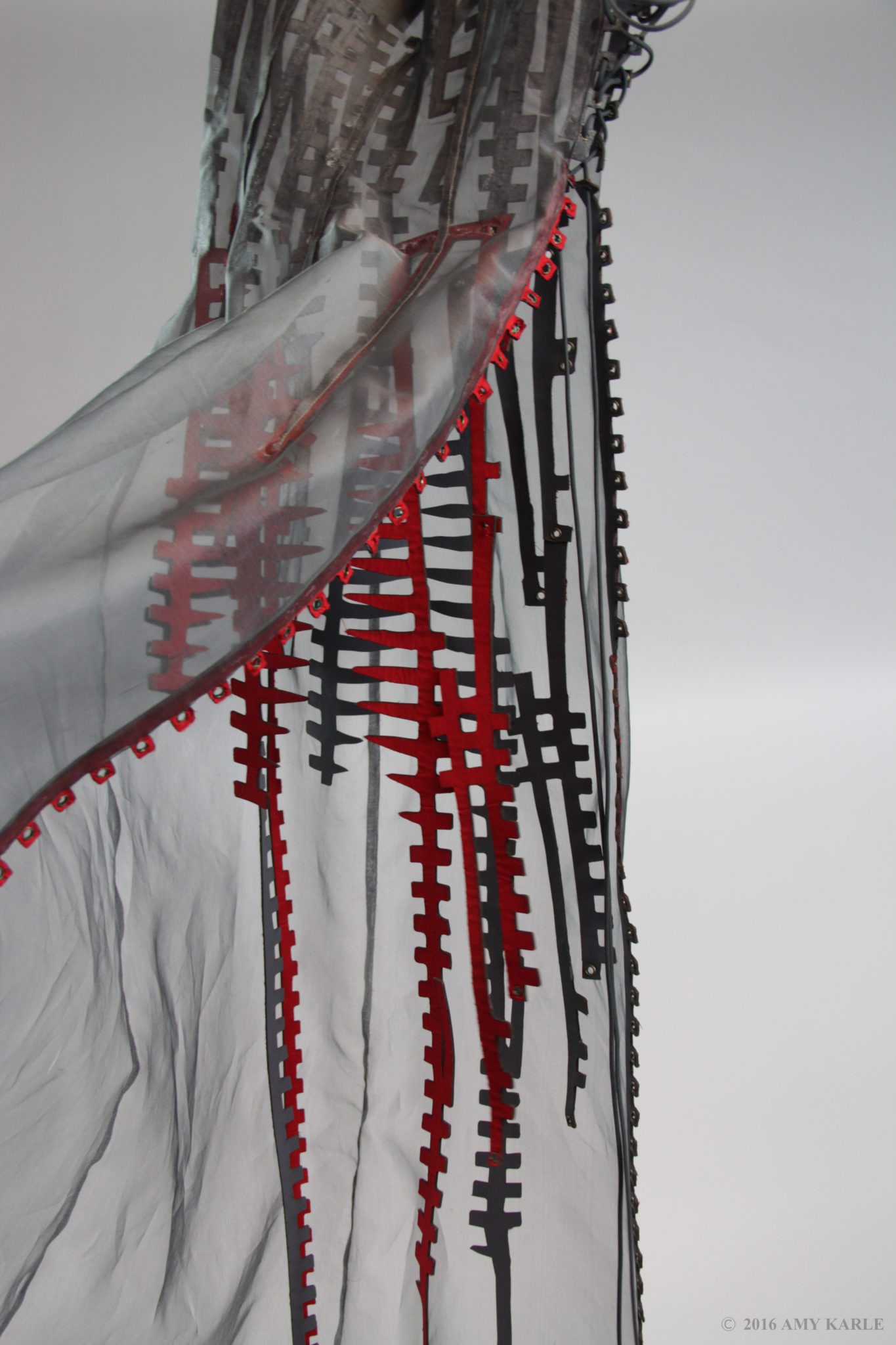 Amy Karle is an artist who uses the mind, body, science and technology to create art. Karle’s artwork taps our ideas of what it means to be human and in this body, expressing internal, ephemeral experiences in visual forms. Working across a variety of platforms she engages questions about what it means to be human by creating projects on, around, or about the body; it is the subject and the medium. Garments based on anatomy Amy Karle, 2016 Silk, polyester, cotton, natural and synthetic fibers. Wearable art garments inspired by the human nervous system, lung, and ligaments. Merging anatomy, fashion, and technology, the pieces are each created in a different method incorporating reality capture, 3D scans of the body, anatomical style drawings into digital designs (CAD), laser cut pattern pieces and finally hand and machine sewn garments. Each design had a unique approach. The “Breathe” lung dress and jumpsuit based on the nervous system was created from anatomical style drawings hand drawn by the artist then rendered into a pattern in the CAD modeling environment; the dress inspired by ligaments was derived from Verlan Dress from New Skins with Francis Bitonti Studio workshop at the Digital Arts and Humanities Research Centre of the Pratt Institute in New York that wrapped form around the body in 3D digital environment which the artist custom fit to a 3D body scan and flattened into flat pattern pieces in order to laser cut and construct out of soft material. In the process of making these pieces, Artist Amy Karle addresses current industrial challenges of: utilizing 3D scanning to create custom fit patterns and garments, unwrapping and flattening complex CAD patterns in the digital environment, advanced pattern making in 3D digital environments into real-world soft goods, and creating zero and low-waste fashion designs.