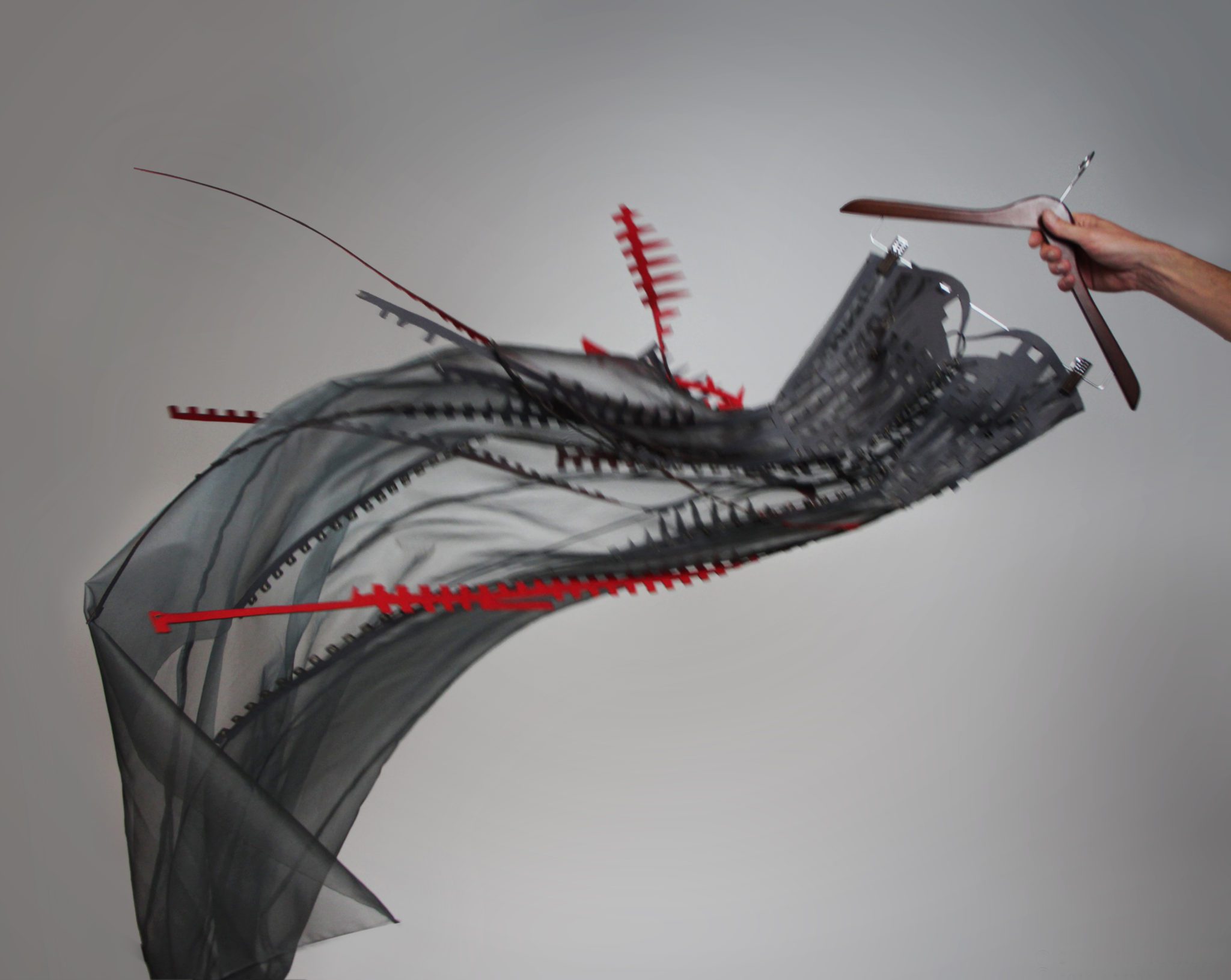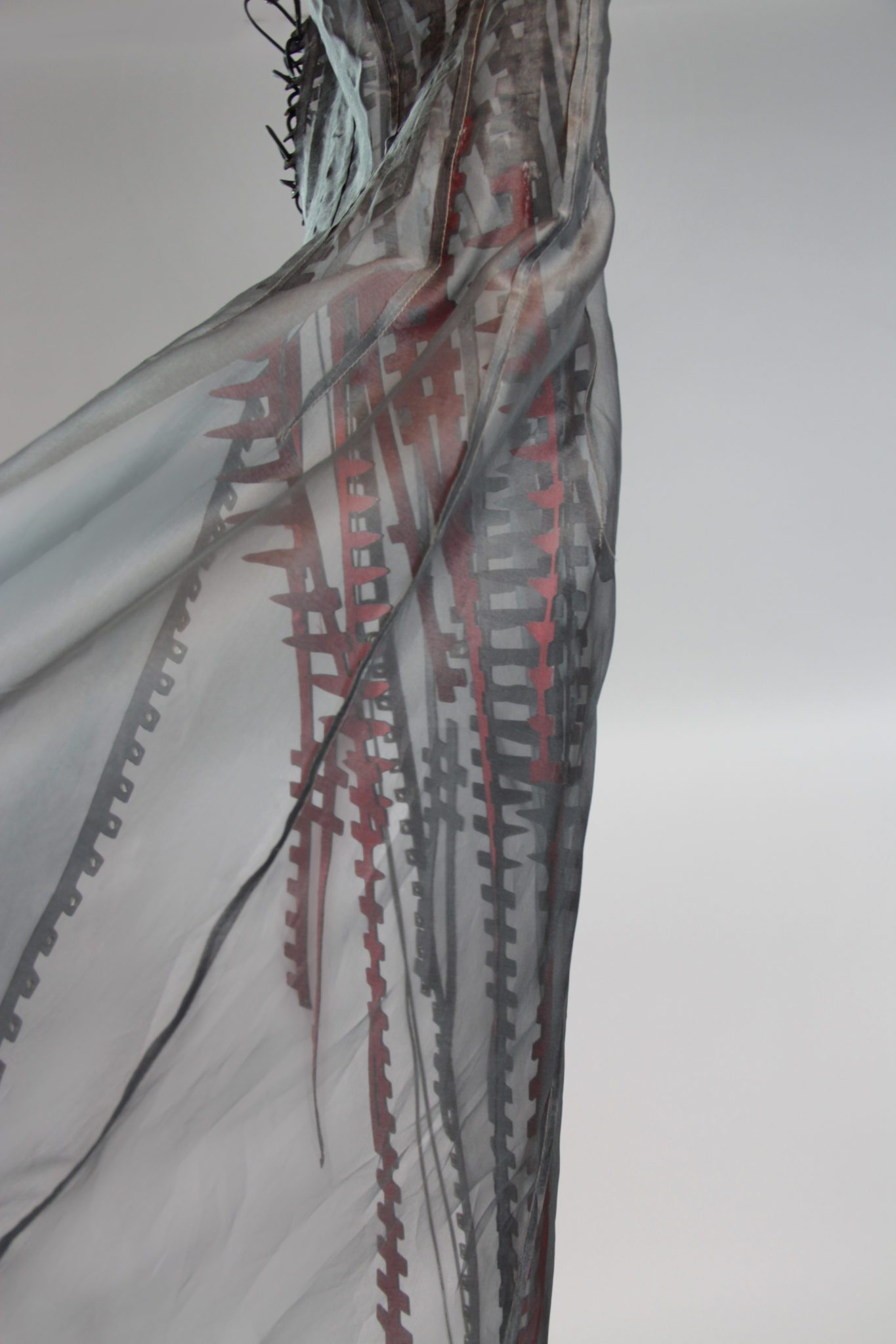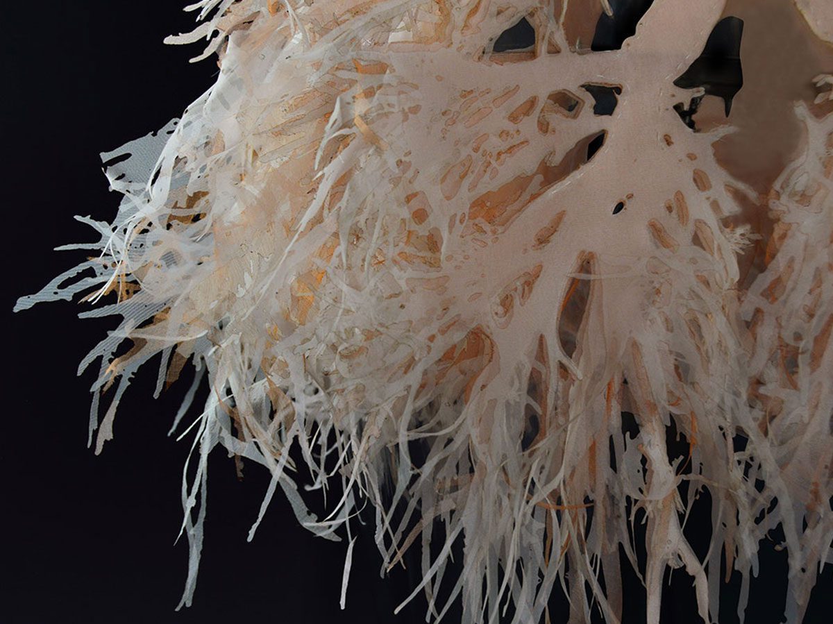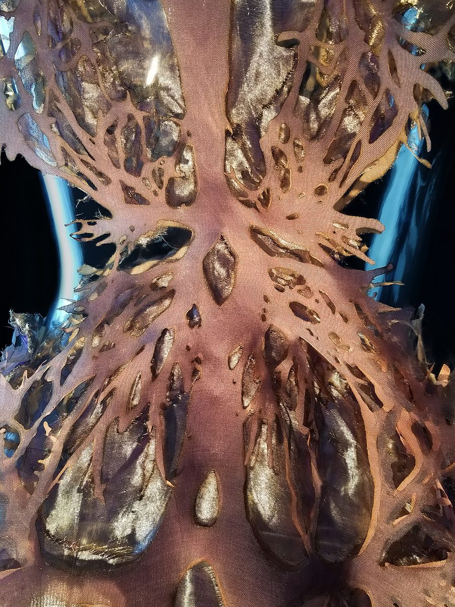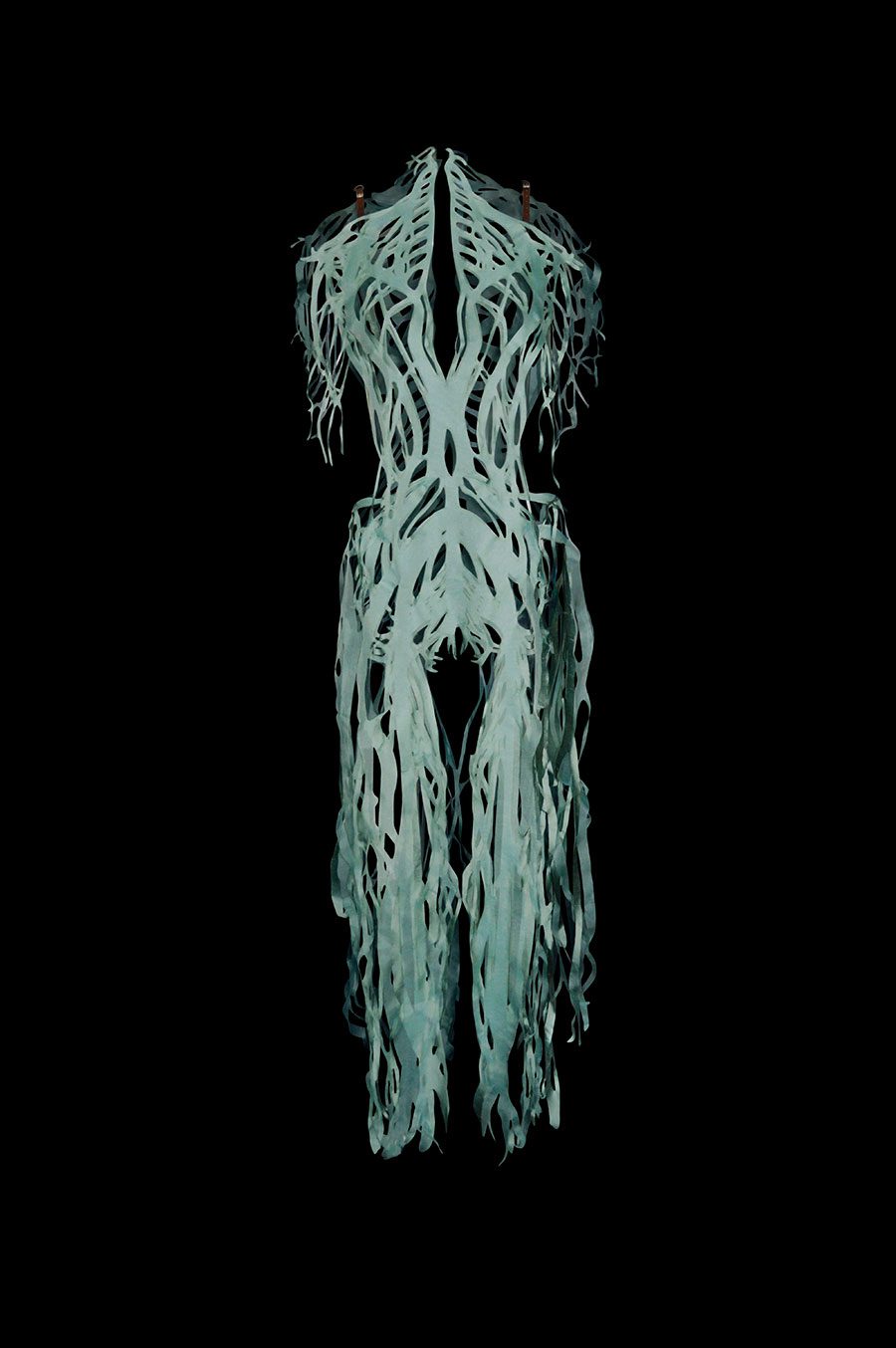 Amy Karle is an artist who uses the mind, body, science and technology to create art. Karle’s artwork taps our ideas of what it means to be human and in this body, expressing internal, ephemeral experiences in visual forms. Working across a variety of platforms she engages questions about what it means to be human by creating projects on, around, or about the body; it is the subject and the medium. Garments based on anatomy Amy Karle, 2016 Silk, polyester, cotton, natural and synthetic fibers. Wearable art garments inspired by the human nervous system, lung, and ligaments. Merging anatomy, fashion, and technology, the pieces are each created in a different method incorporating reality capture, 3D scans of the body, anatomical style drawings into digital designs (CAD), laser cut pattern pieces and finally hand and machine sewn garments. Each design had a unique approach. The “Breathe” lung dress and jumpsuit based on the nervous system was created from anatomical style drawings hand drawn by the artist then rendered into a pattern in the CAD modeling environment; the dress inspired by ligaments was derived from Verlan Dress from New Skins with Francis Bitonti Studio workshop at the Digital Arts and Humanities Research Centre of the Pratt Institute in New York that wrapped form around the body in 3D digital environment which the artist custom fit to a 3D body scan and flattened into flat pattern pieces in order to laser cut and construct out of soft material. In the process of making these pieces, Artist Amy Karle addresses current industrial challenges of: utilizing 3D scanning to create custom fit patterns and garments, unwrapping and flattening complex CAD patterns in the digital environment, advanced pattern making in 3D digital environments into real-world soft goods, and creating zero and low-waste fashion designs.