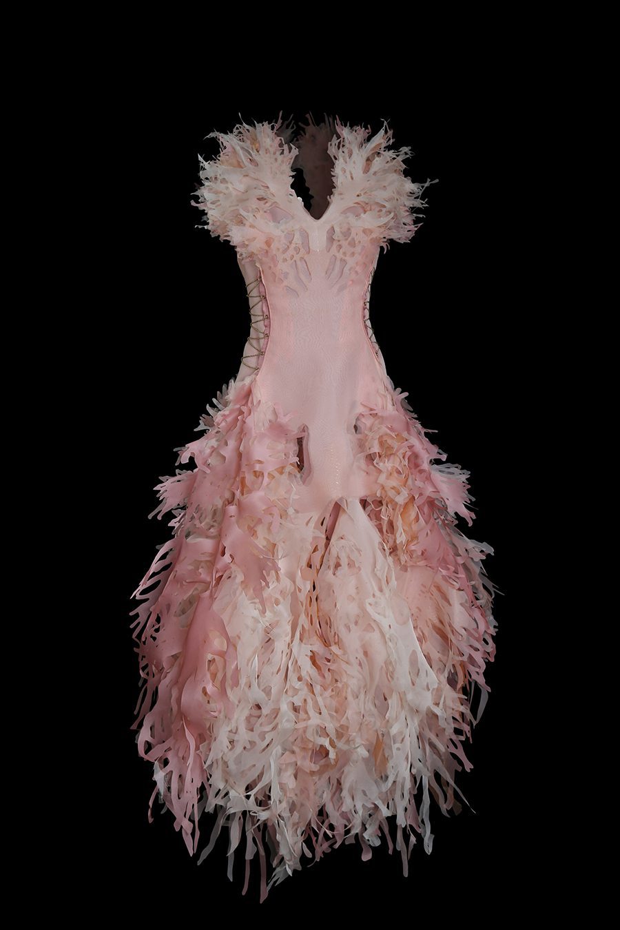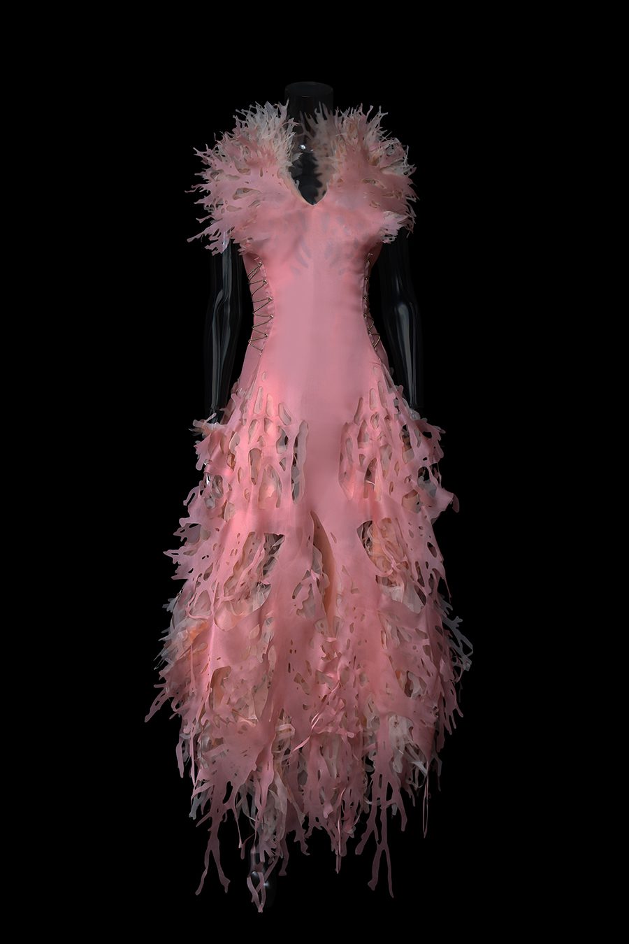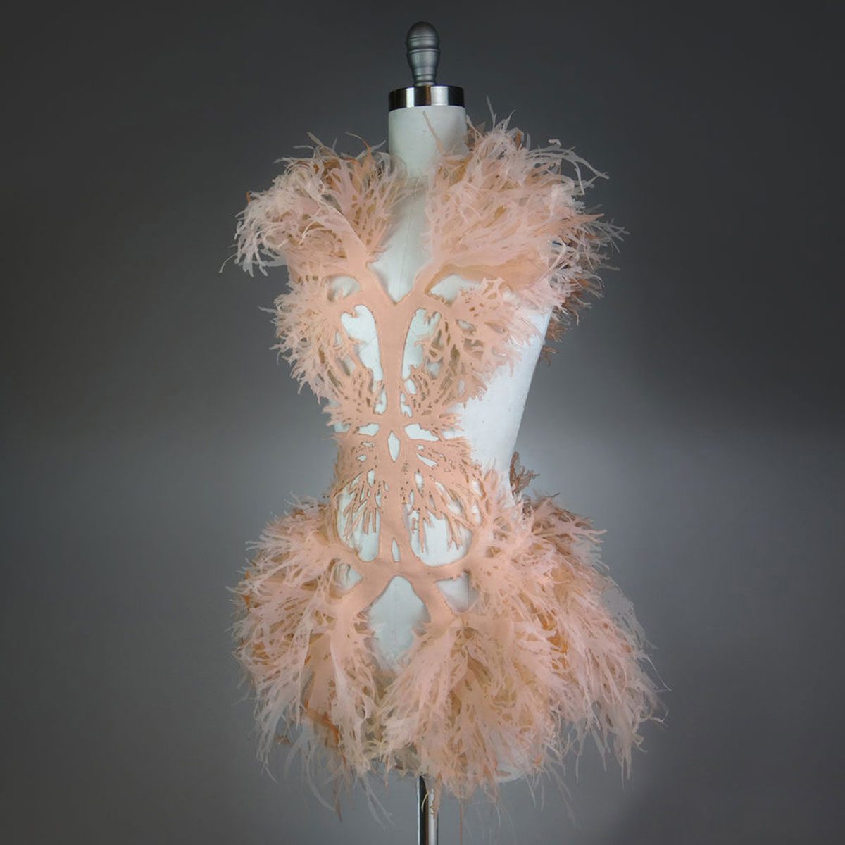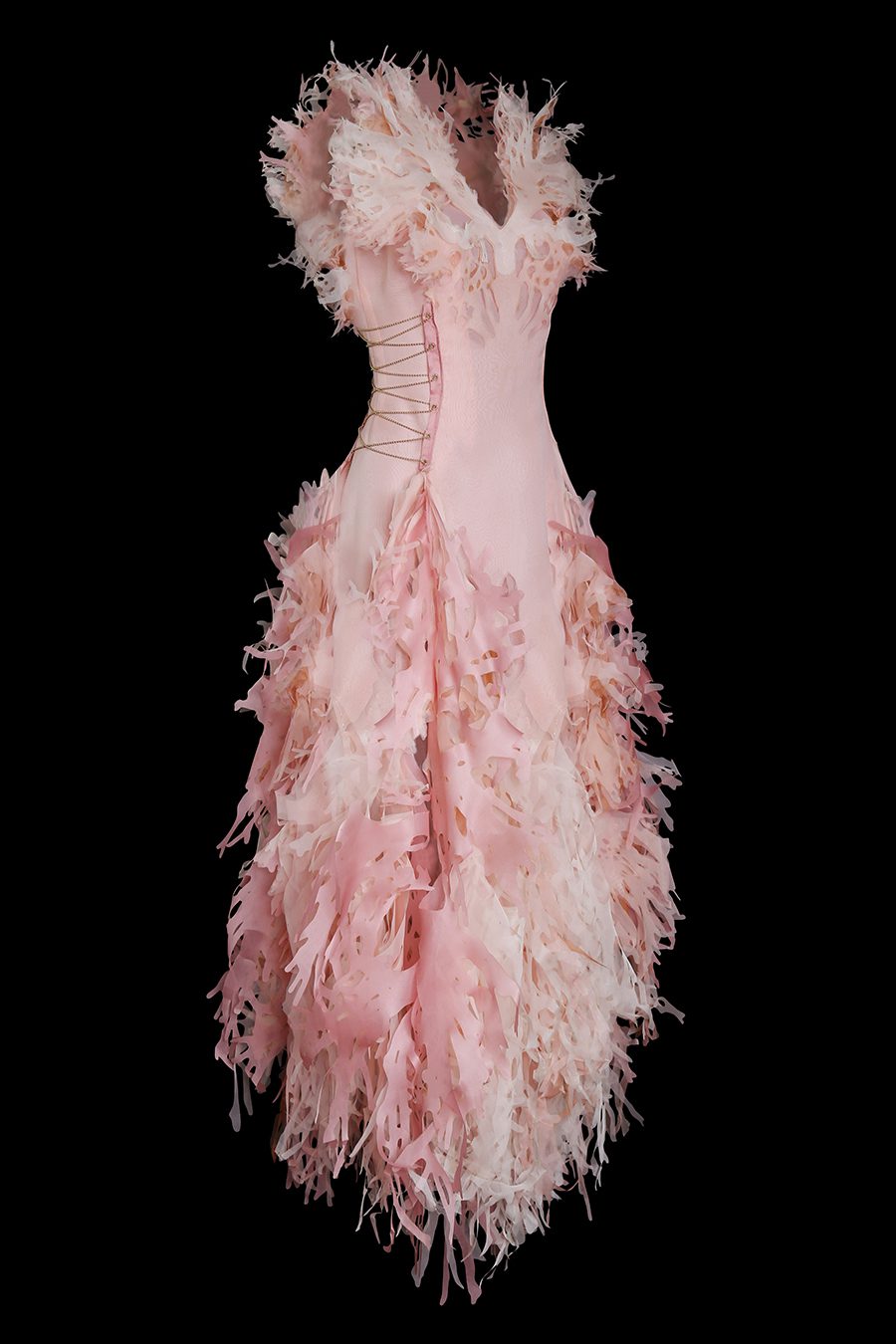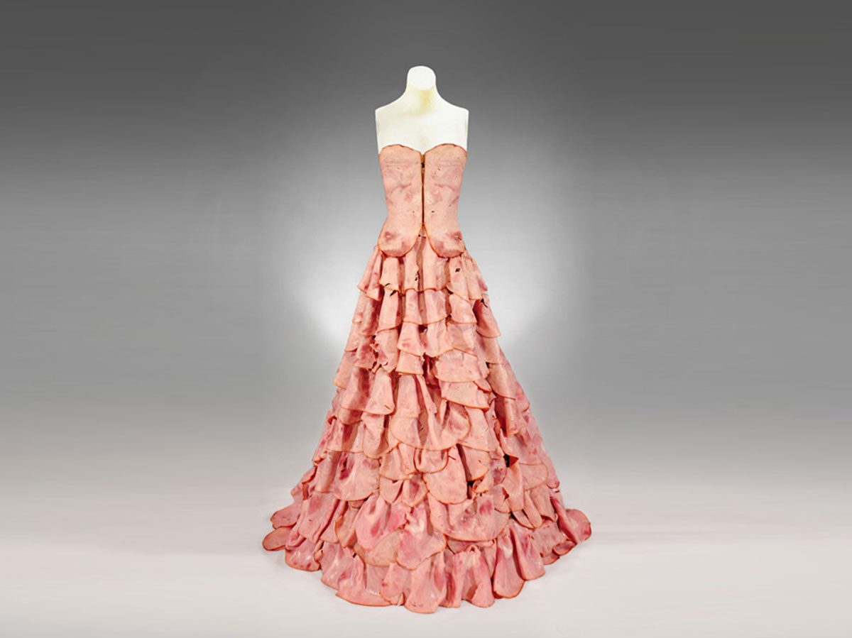 Addressing the ephemerality of physical beauty, Artist Amy Karle made this “pretty pink dress” by suturing together lunch meat cold cuts which spoil in a short period of time.