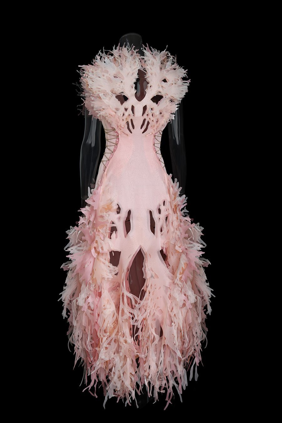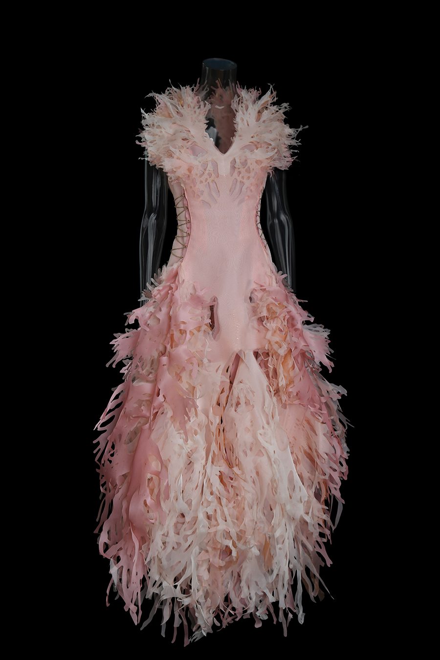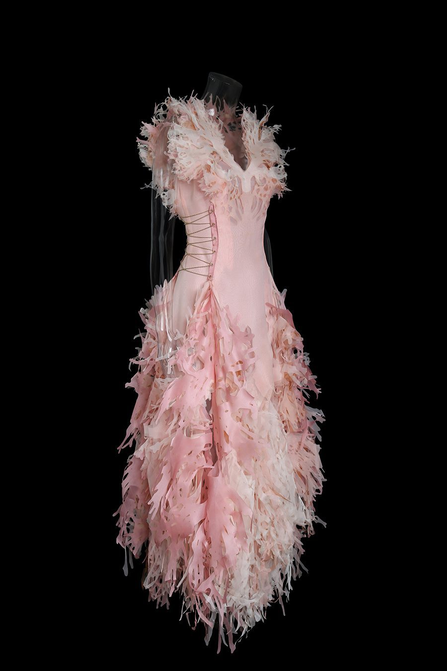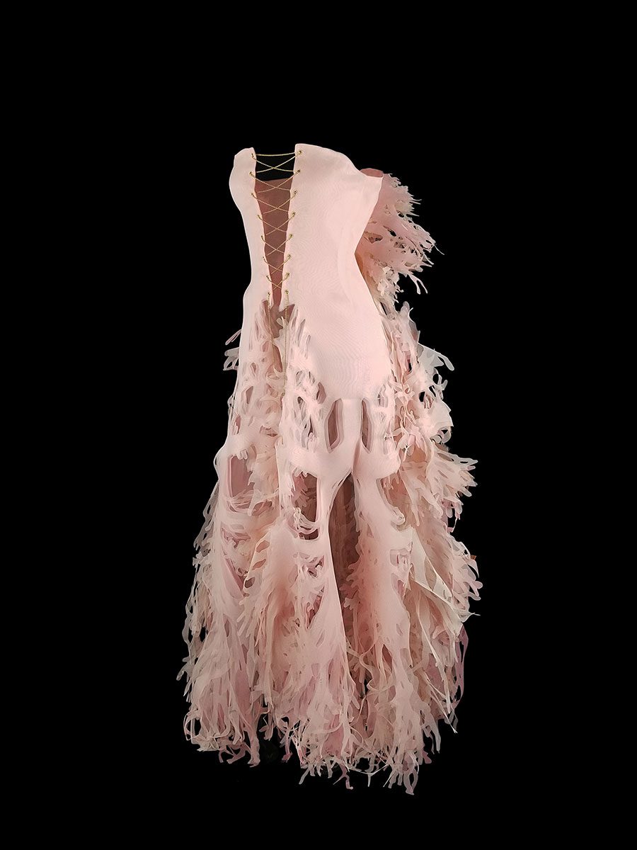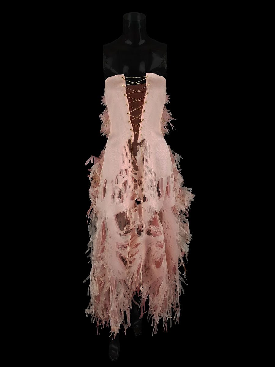 Addressing the ephemerality of physical beauty, Artist Amy Karle made this “pretty pink dress” by suturing together lunch meat cold cuts which spoil in a short period of time.