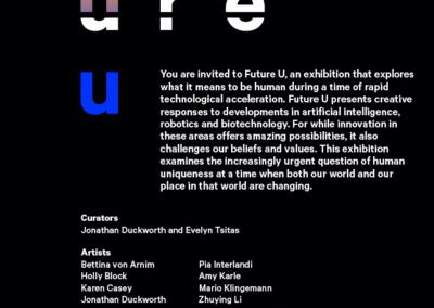 Speculative and emotionally charged, Future U responds to the complex possibilities of the rapid acceleration and convergence of technologies and its impact what it means to be human.