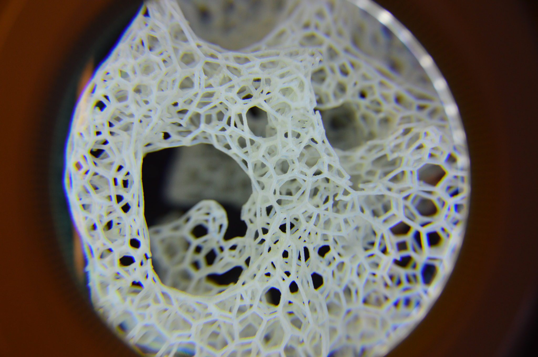 Sculpture: digitally manufactured, hand-finished 3D print created from 3D scan data of a human skull, digital design and generative art. Pattern speculatively designed for direct skeletal implant, osseointegration and potential osteoconduction dependent on materials used.