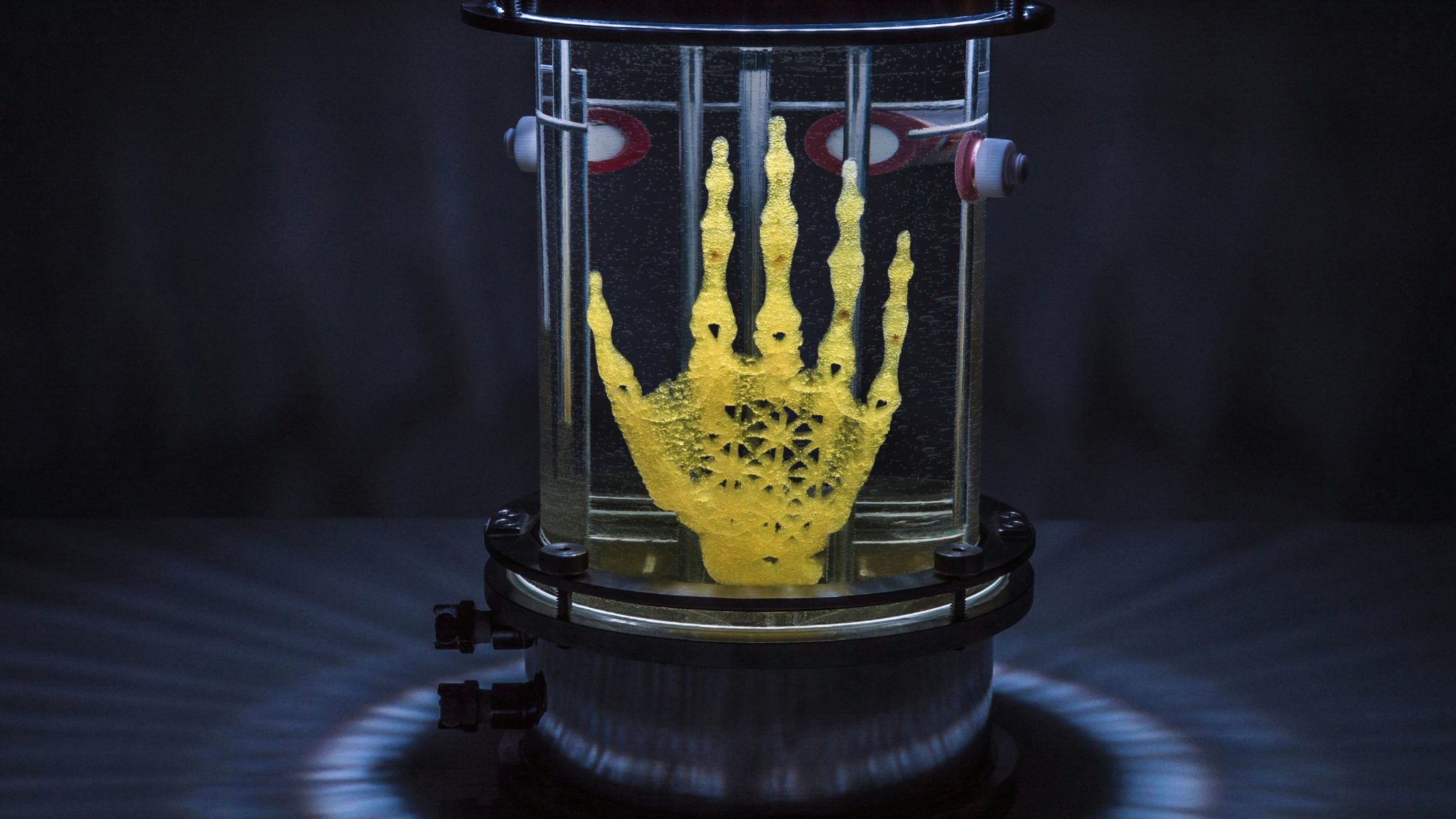 Housed in a mechanical womb of scientific equipment, the human hand-like design appears to glow from within, lit from the interior and reflecting out into surrounding darkness. Conceptually, the human hand design was selected because this part of the human skeleton is one of the few structures that is instantly recognizable as uniquely human. The ornate aesthetic was derived from functional design requirements: the overall lattice was created for biomimetic osseointegration; on the microscopic level the scaffold mimics the trabecular structure of bone, the shape that triggers stem cells to become bone cells. The distinct yellow color of the sculpture was required in order to 3D print with such detail in a biodegradable, biocompatible material. Although this specific sculpture is intended to live outside of the Although this specific sculpture is intended to live outside of the body, the design suggests that future versions could potentially be implanted and integrated with existing biological features.